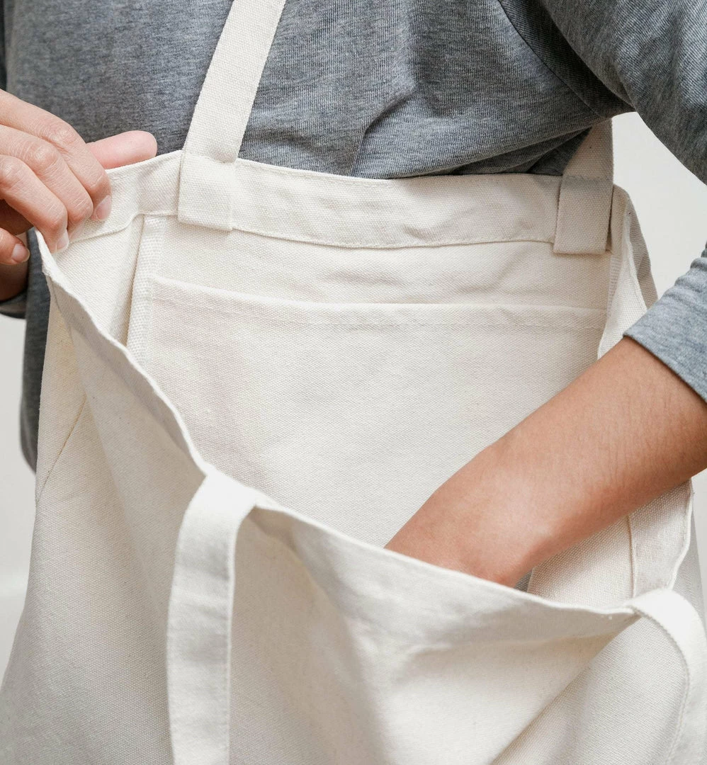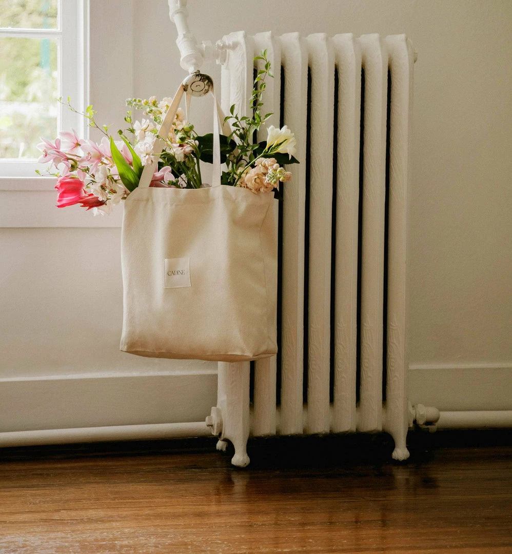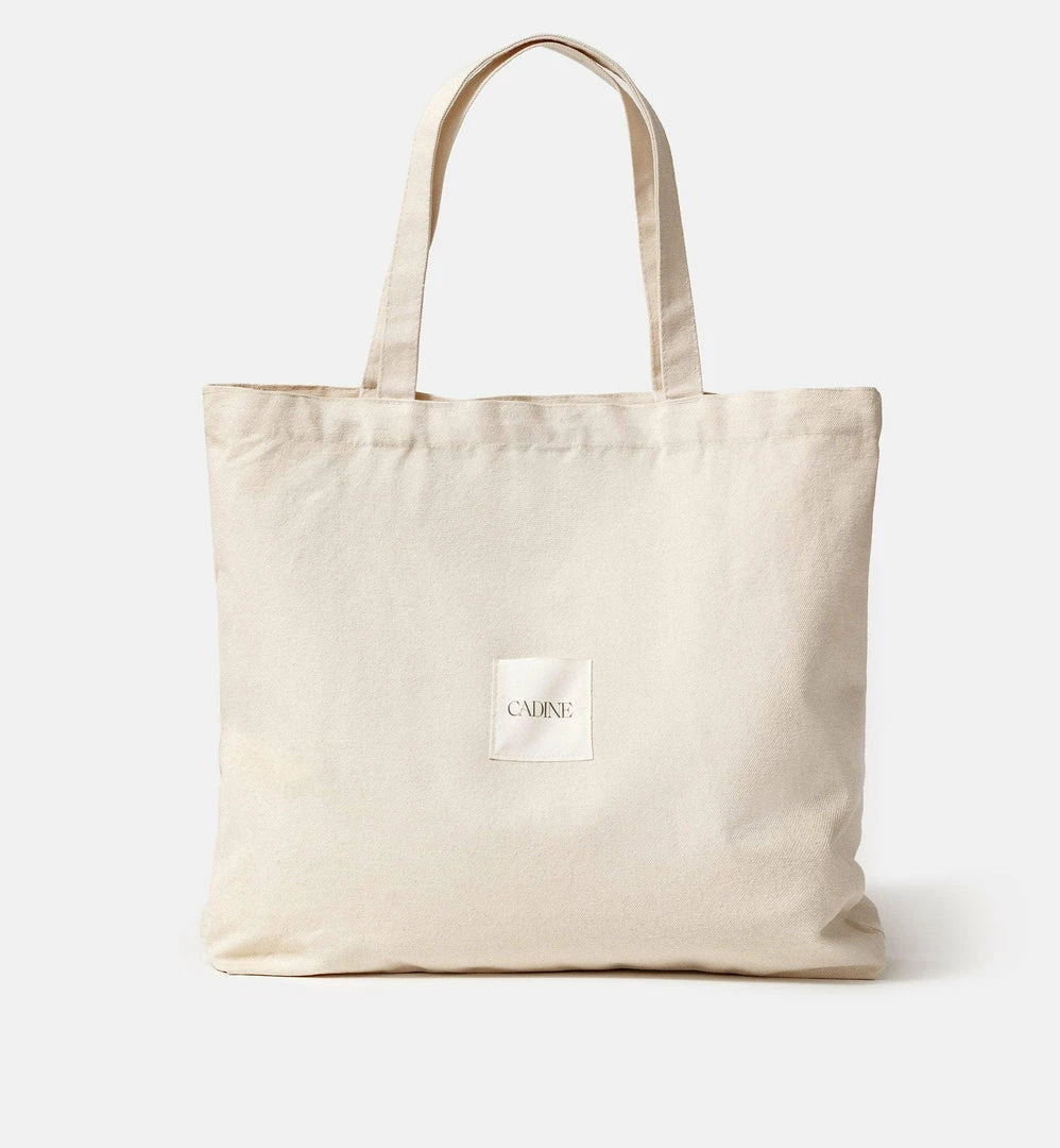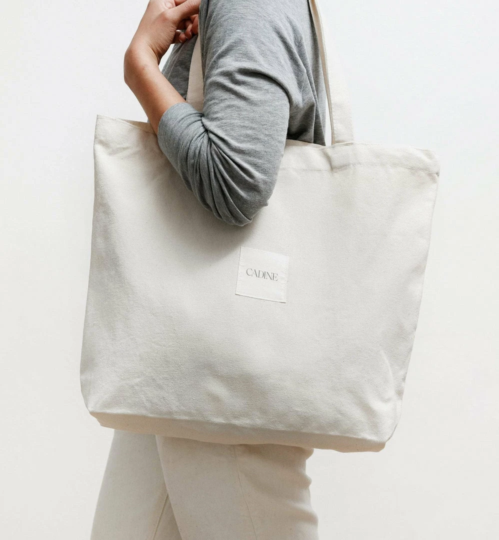 100% organic cotton canvas Cadine tote, unbleached, interior side pocket, interior pocket, flat bottom, 15″ x 13.5″ x 4″ (38cm x 34cm x 10cm).