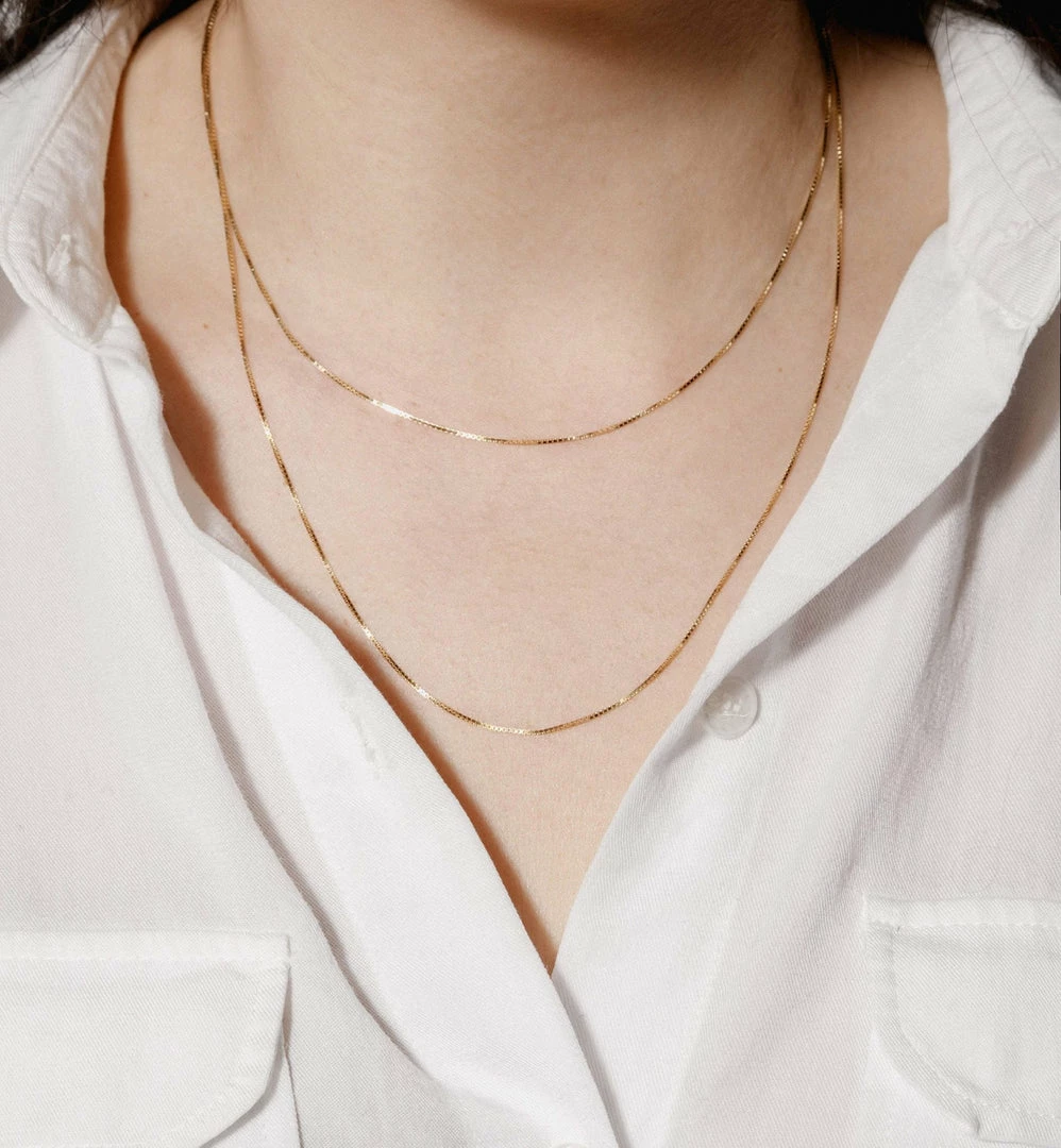 14kt yellow gold chain available in options of 16″, 18″ or 20″ length for layering or highlighted on its own, self-closing lobster style clasp is secure and user-friendly. Model is pictured wearing the 16″ and 20″ together.Â
