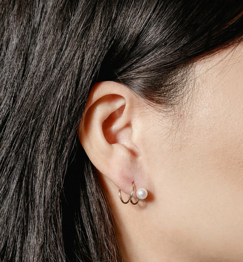 Pearl spiral earrings, freshwater cultured pearls, 4-4.5mm, 14kt yellow gold. Swirls into the piercing from the front or the back for different looks.