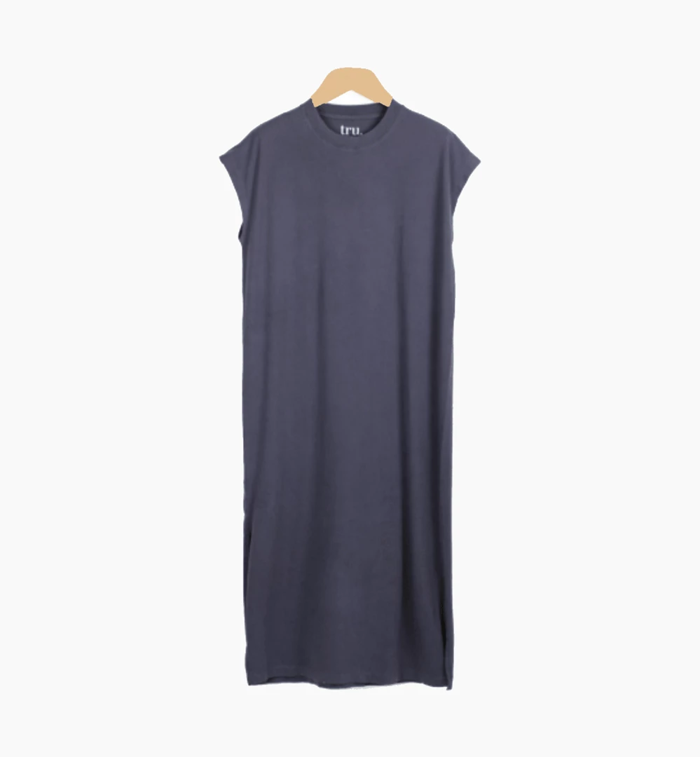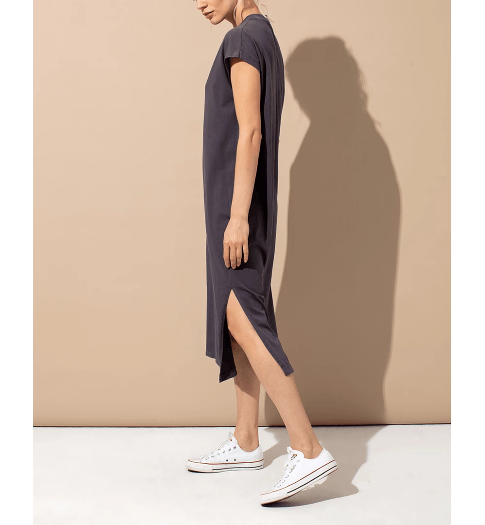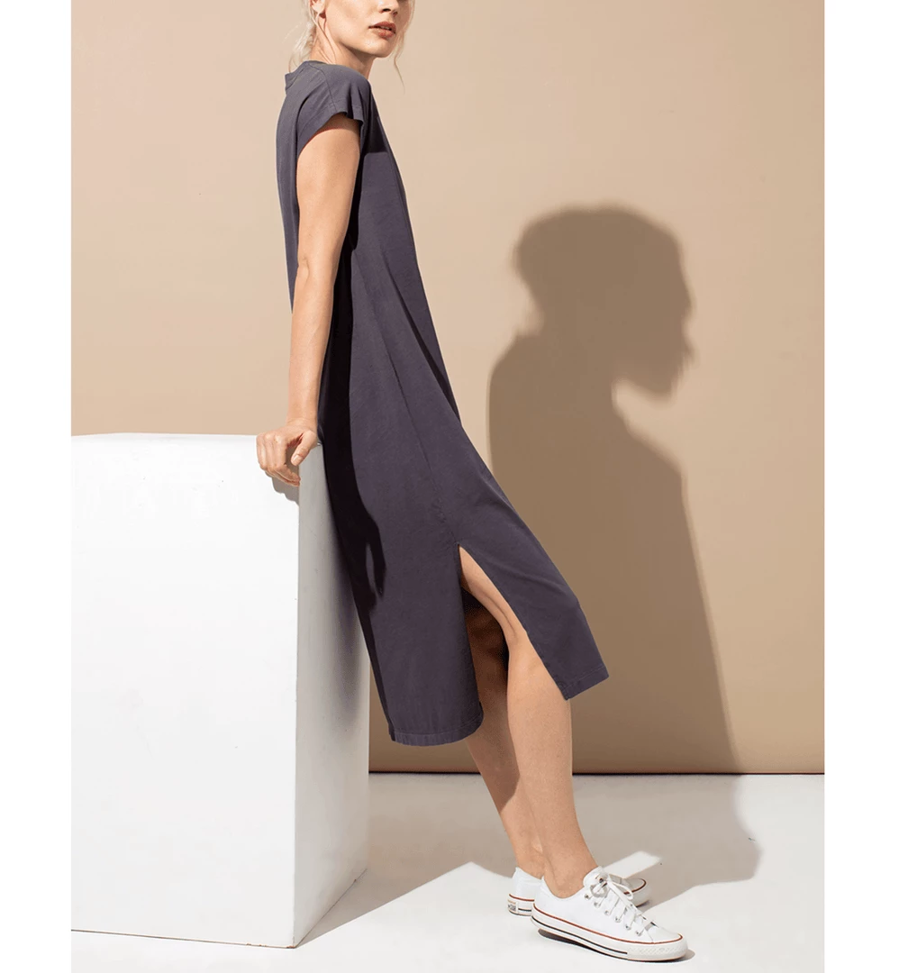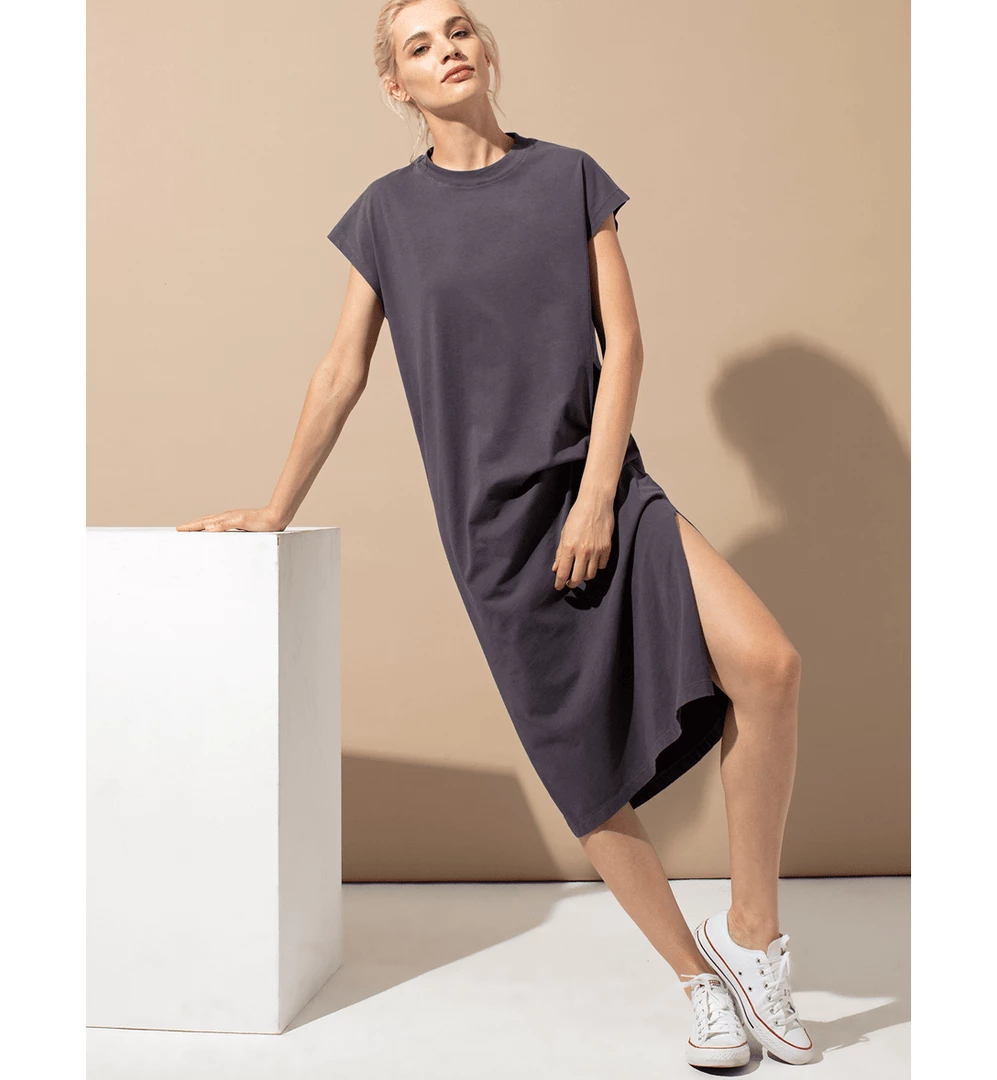 Crew neck cap sleeve t-shirt dress, shin length, straight fit, 2 side slits, 100% premium Aegean cotton.