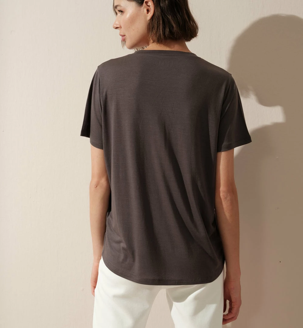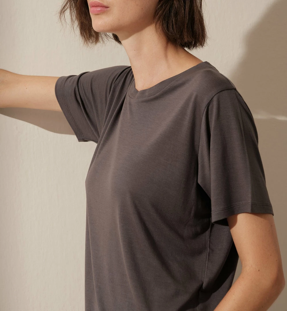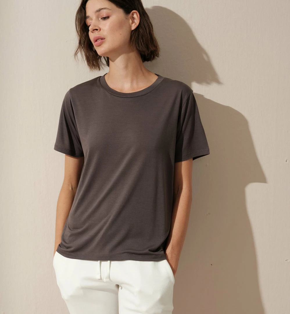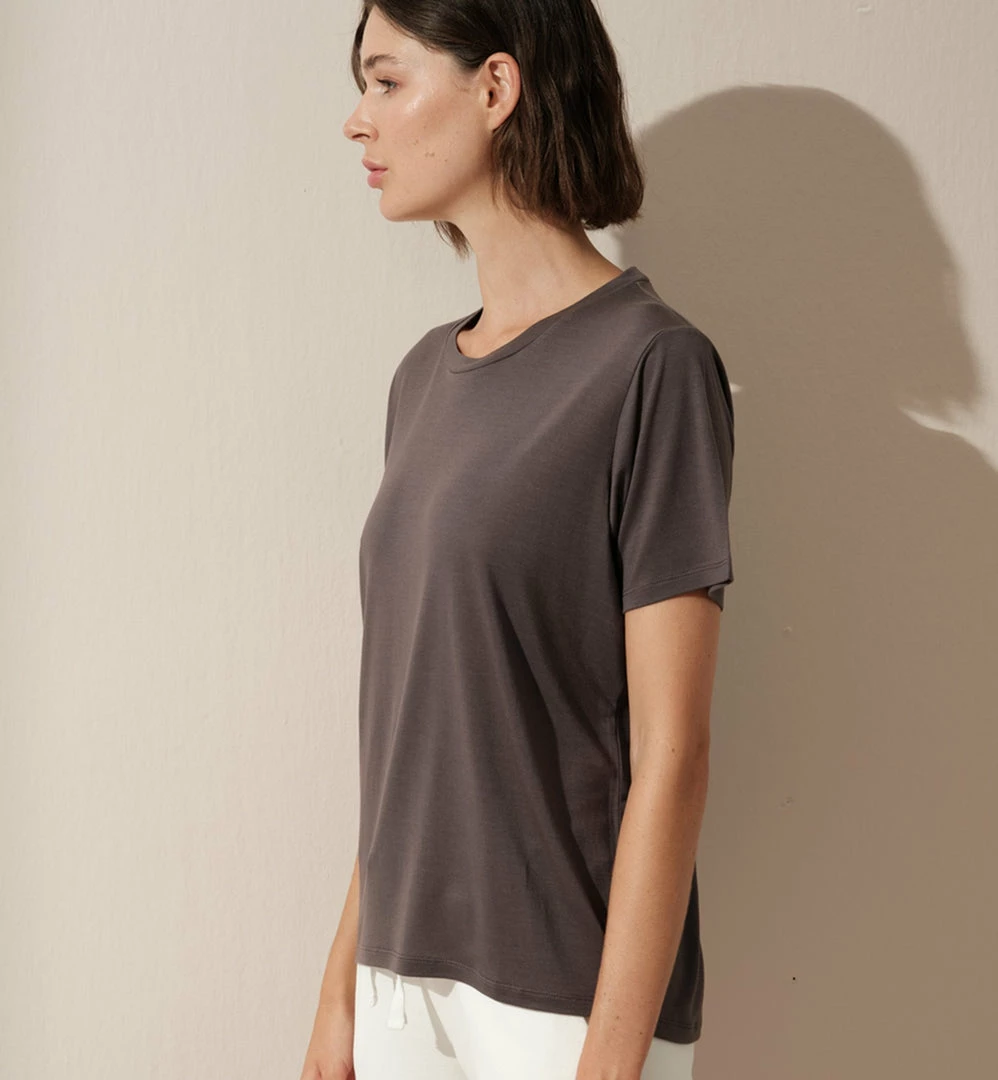 Crew neck t-shirt, everyday relaxed fit, ecologically sustainable, 100% TENCEL™ lyocell. Seen here paired with our Pedestal Joggers.