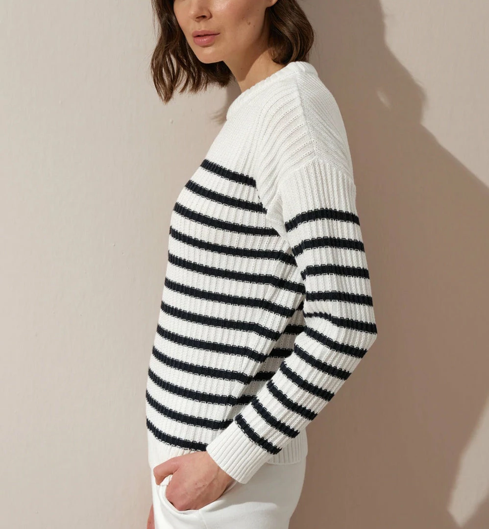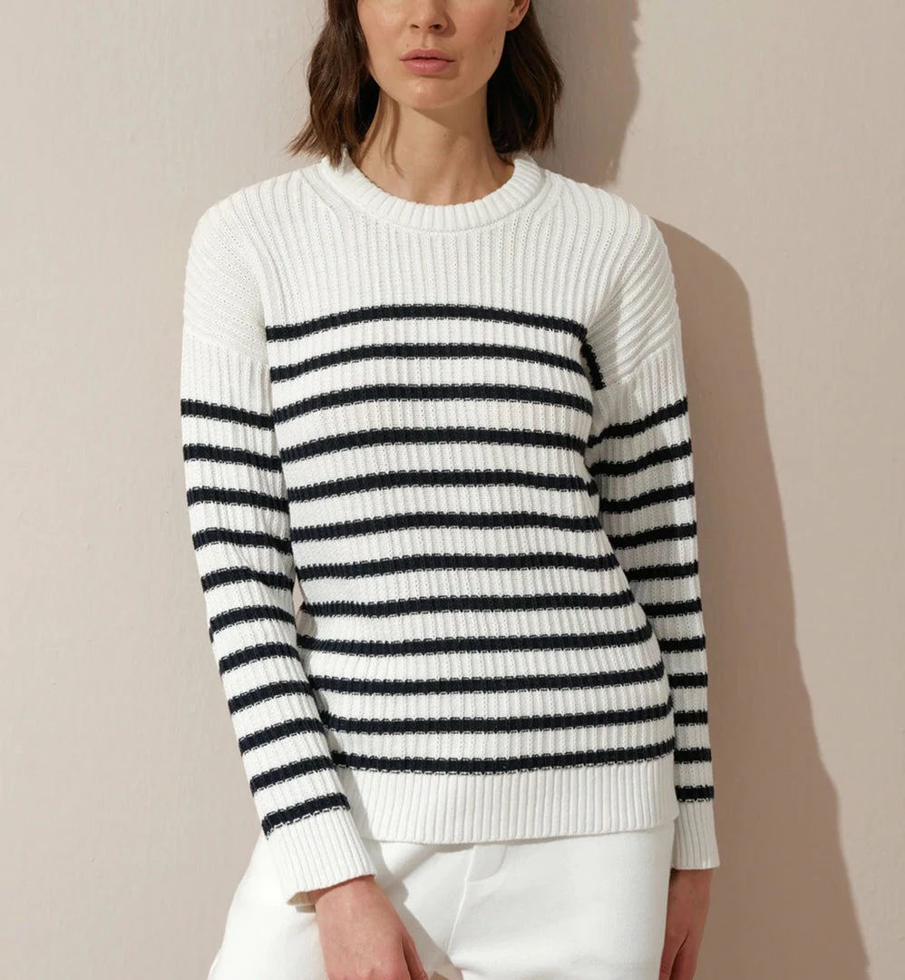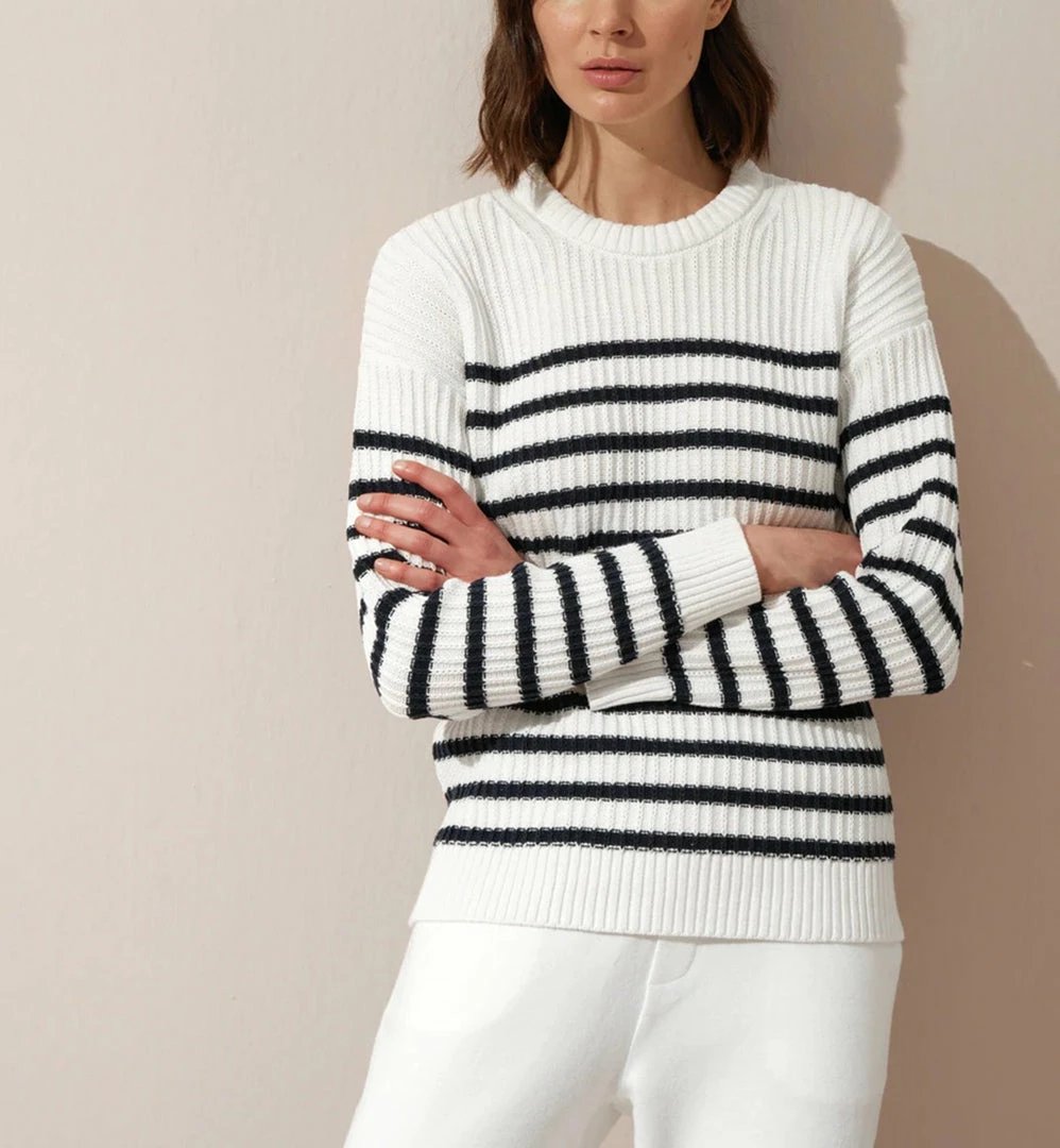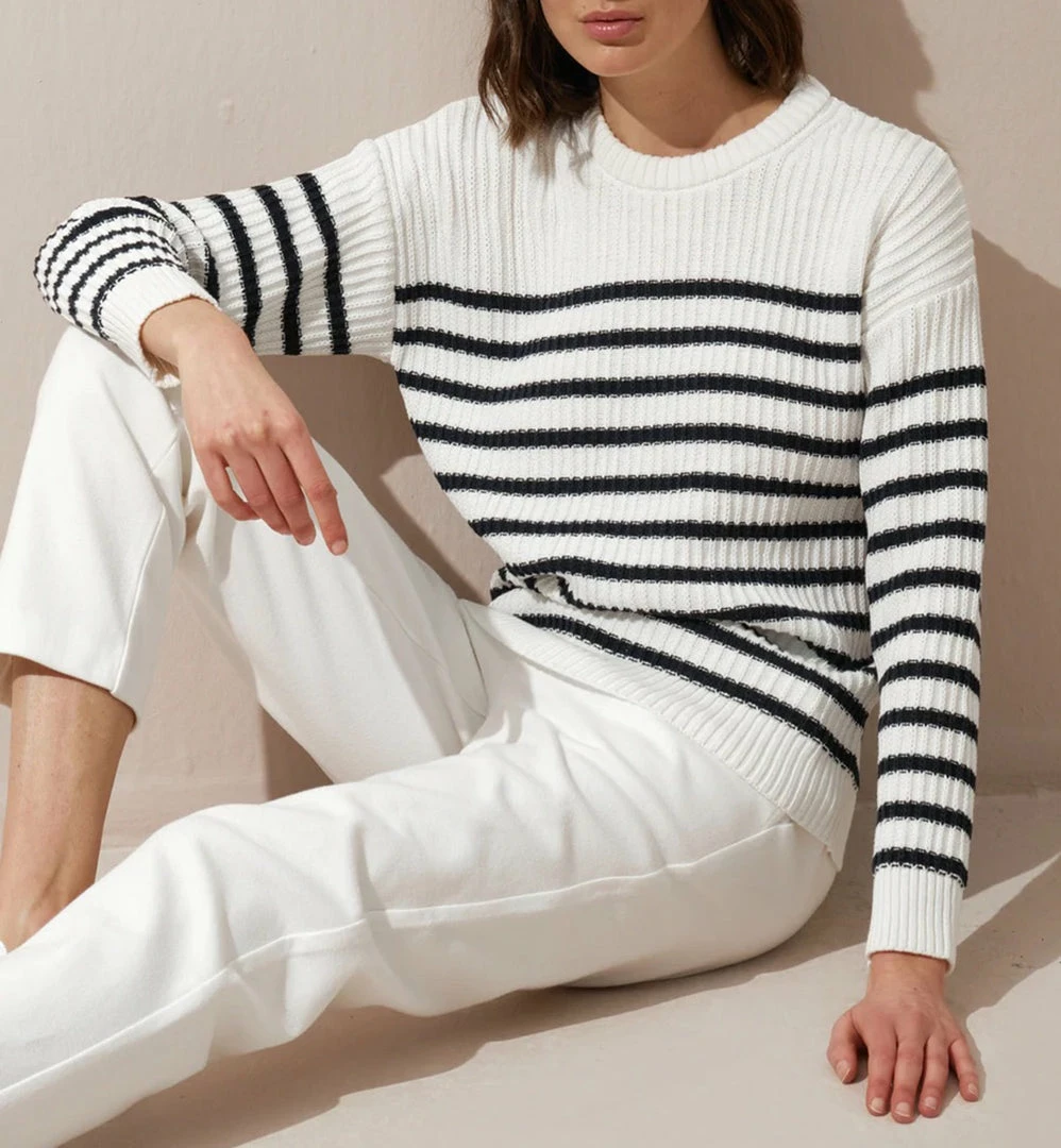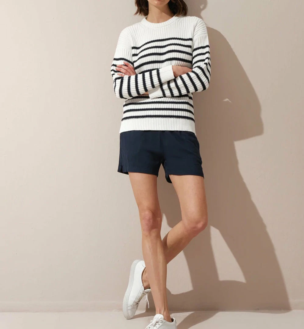 Crew neck long sleeve sweater, drop shoulder, medium weight, straight fit, 100% Aegean cotton. Modeled here with our Zen Pant and Arc Shorts.