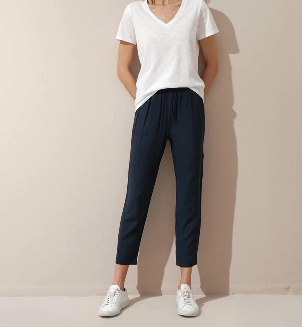 Easy pull-on pant, elastic waistband, side pockets, 100% crepe viscose.