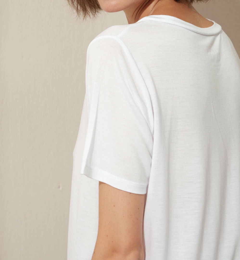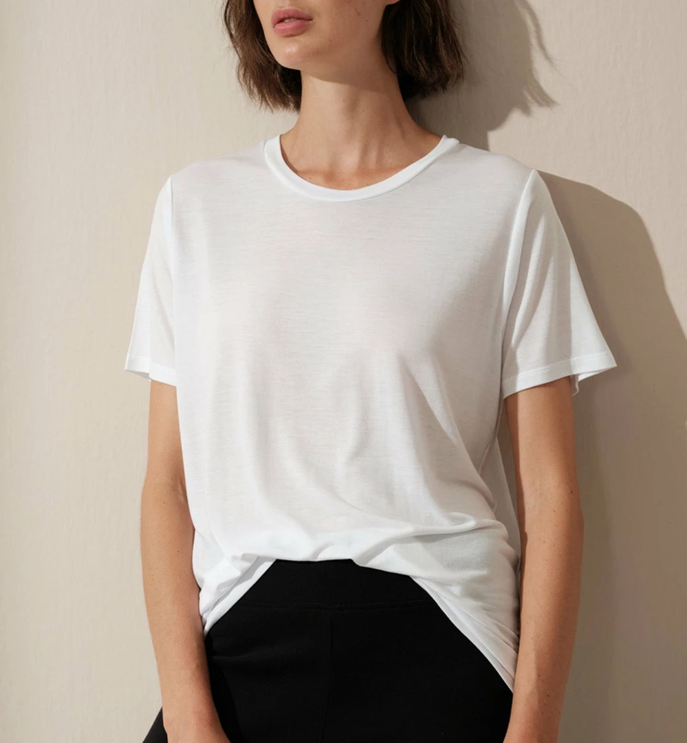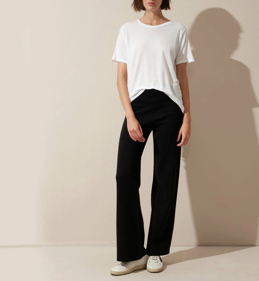 Crew neck t-shirt, everyday relaxed fit, ecologically sustainable, 100% TENCEL™ lyocell. Seen here with our Pillar Pant.