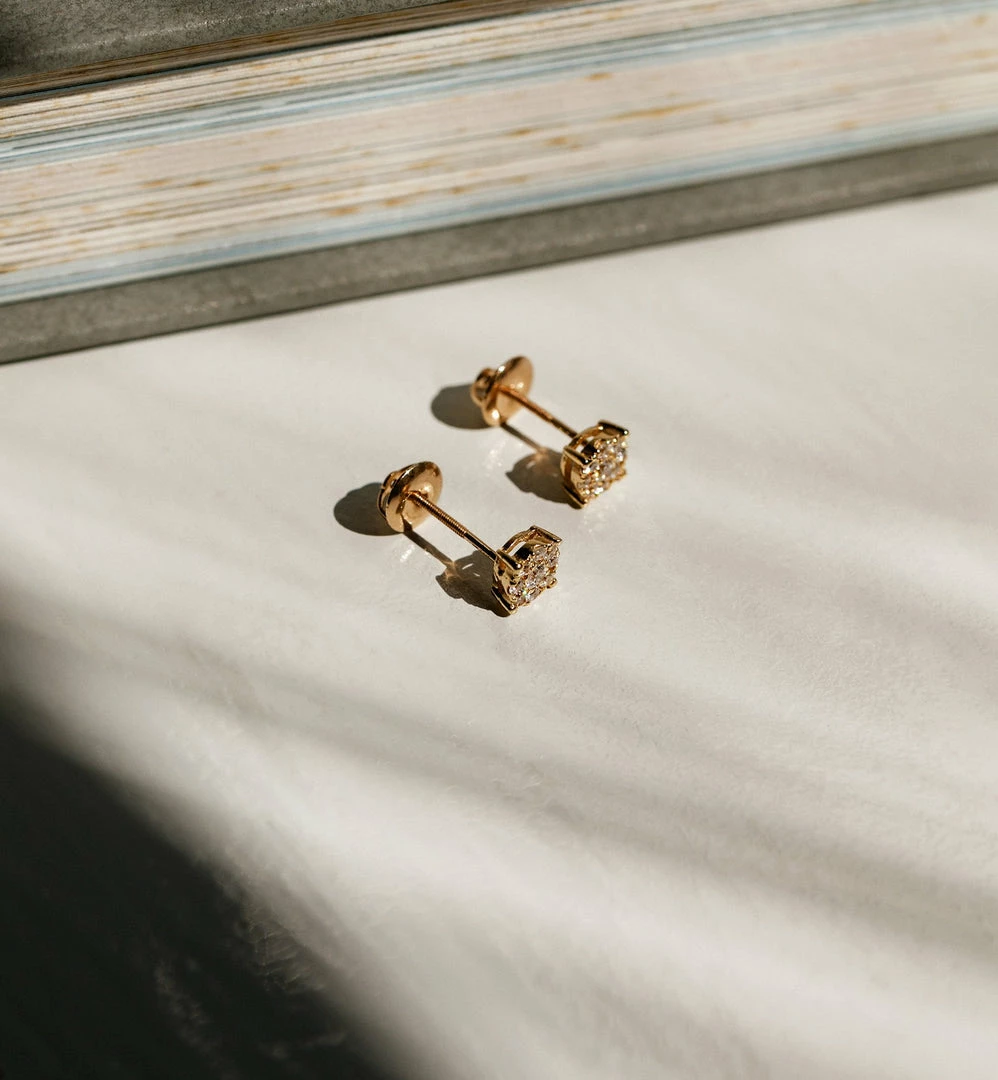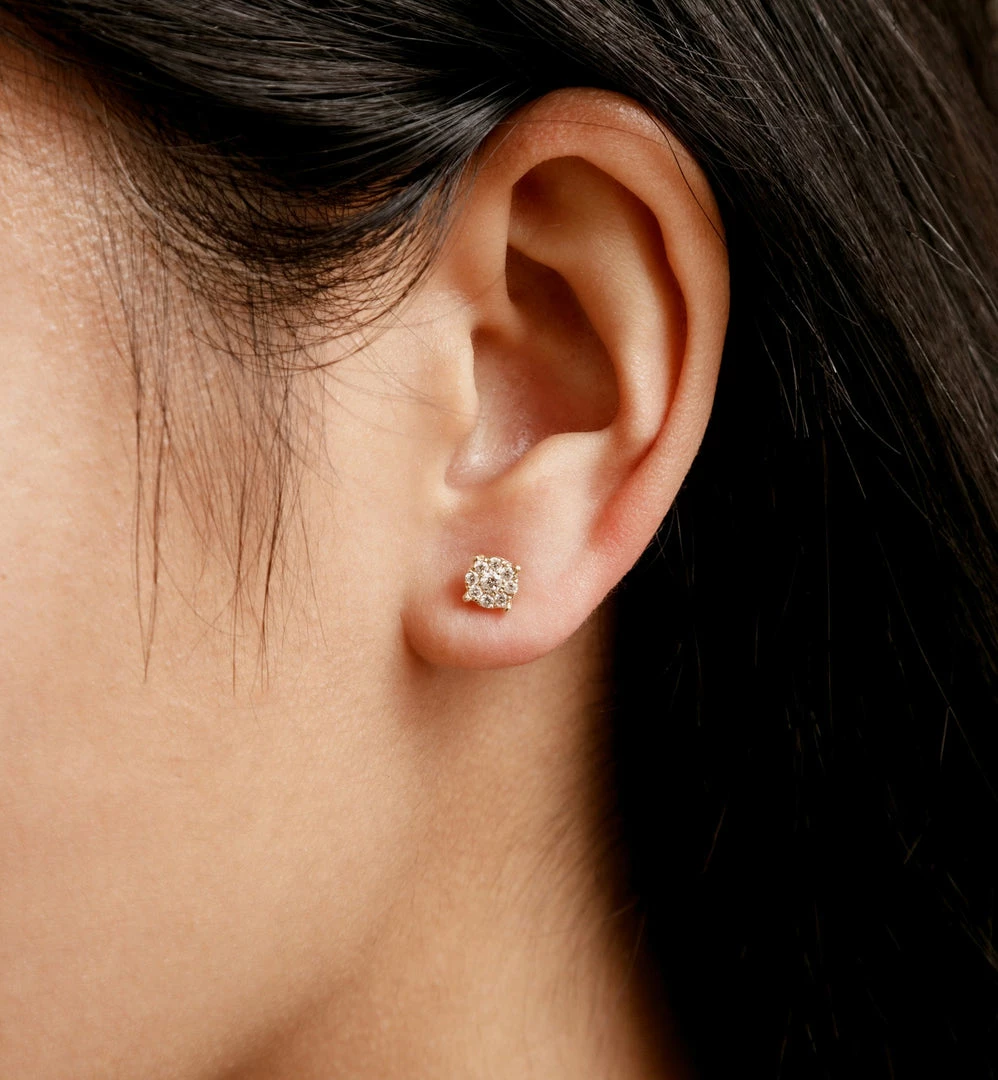 Pair of diamond cluster stud earrings, 0.23 carat SI,14kt yellow gold. Screw back design for additional security and peace of mind.