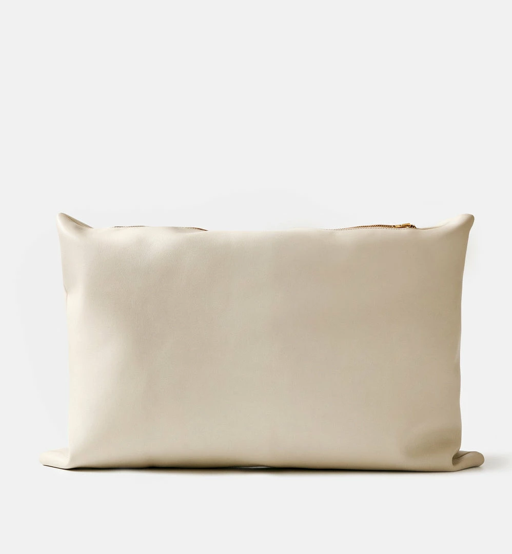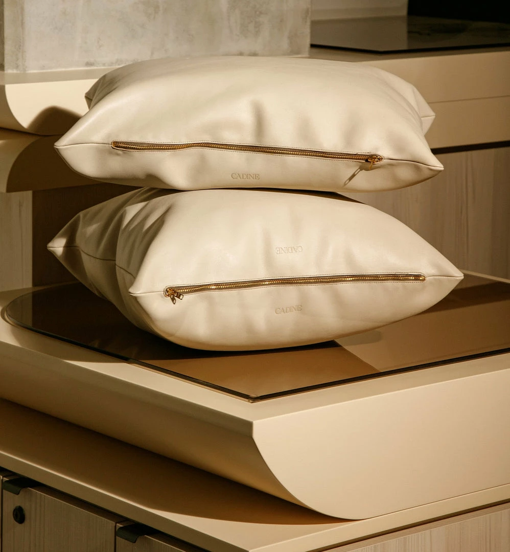 100% genuine Italian full leather rectangular pillow with insert, 13.5″ x 19″ (34.3cm x 48.2cm), gold zipper detail, signature Cadine emboss.