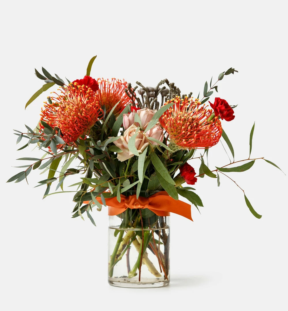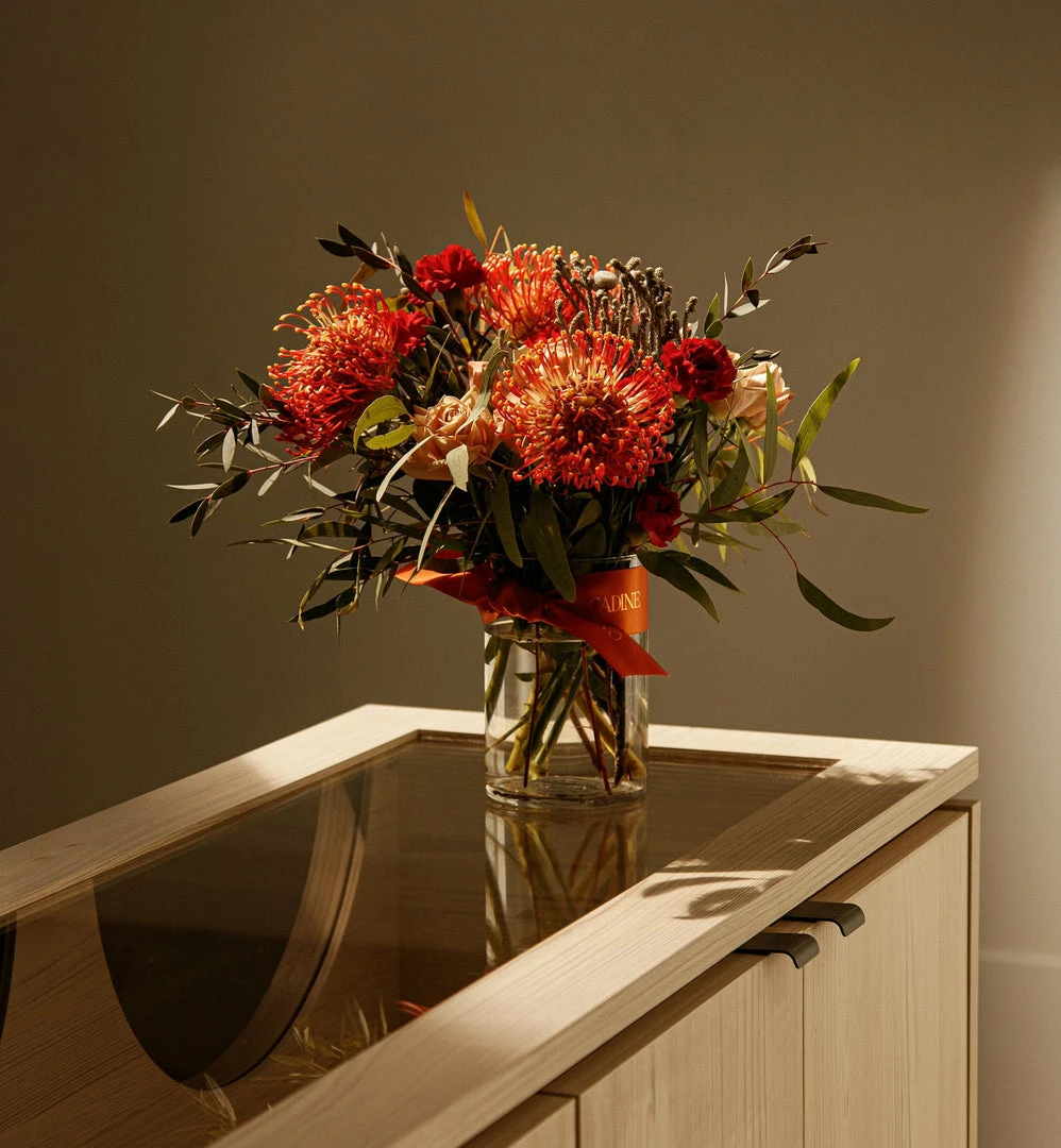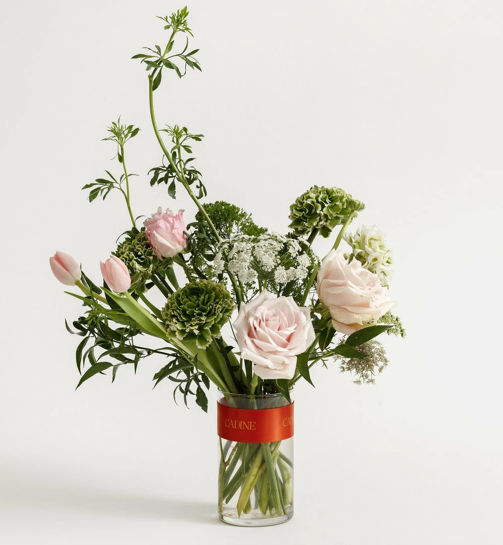Designer’s choice of seasonal fresh flowers and foliage in 4″ x 6″ (10.1cm x 15.2cm) glass vase complete with Cadine wrapping. We take pride in selecting the freshest stems and most beautiful blooms for each order. Expect to find whimsical and unusual flowers and foliage in our delightful arrangements. Bouquet will vary from photograph but style and quality will remain consistent.