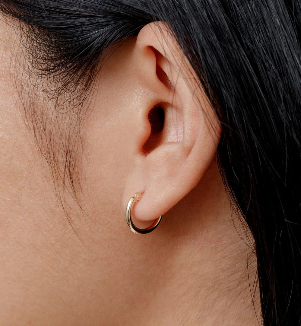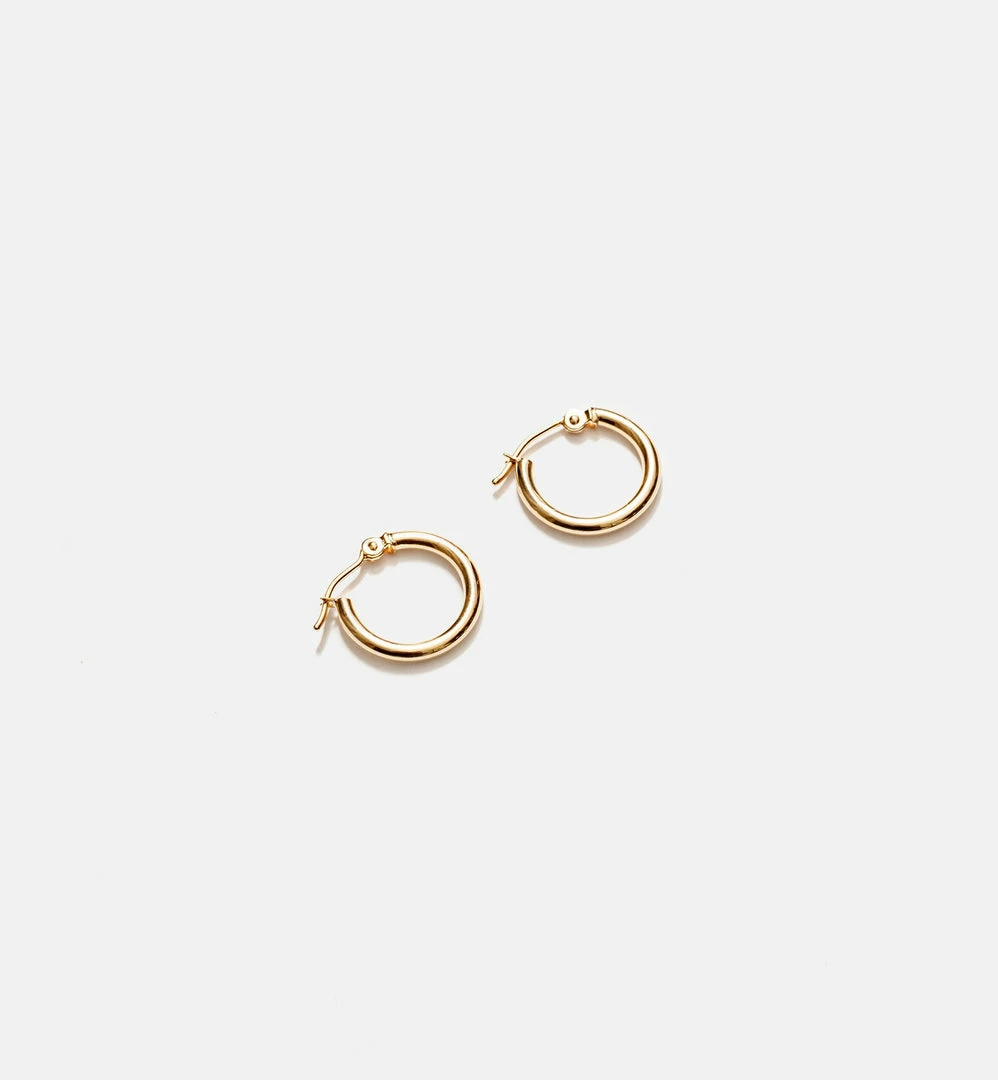 A pair of minimalist gold hoop earrings, 15mm diameter, 14kt yellow gold.