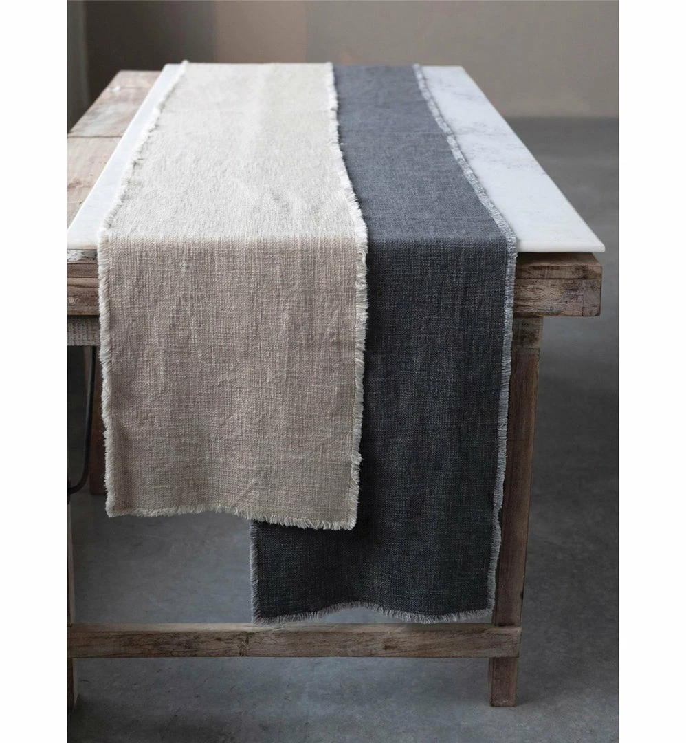 This table runner is perfect for any dining or kitchen table year round. With a rich textured linen weave and a beautiful natural color with frayed edges, this runner offers versatility in any tablescape and home. 108 x 14 in. 49% linen, 19% cotton, 17% acrylic, 15% rayon. Machine wash cold gentle cycle. Tumble dry low.