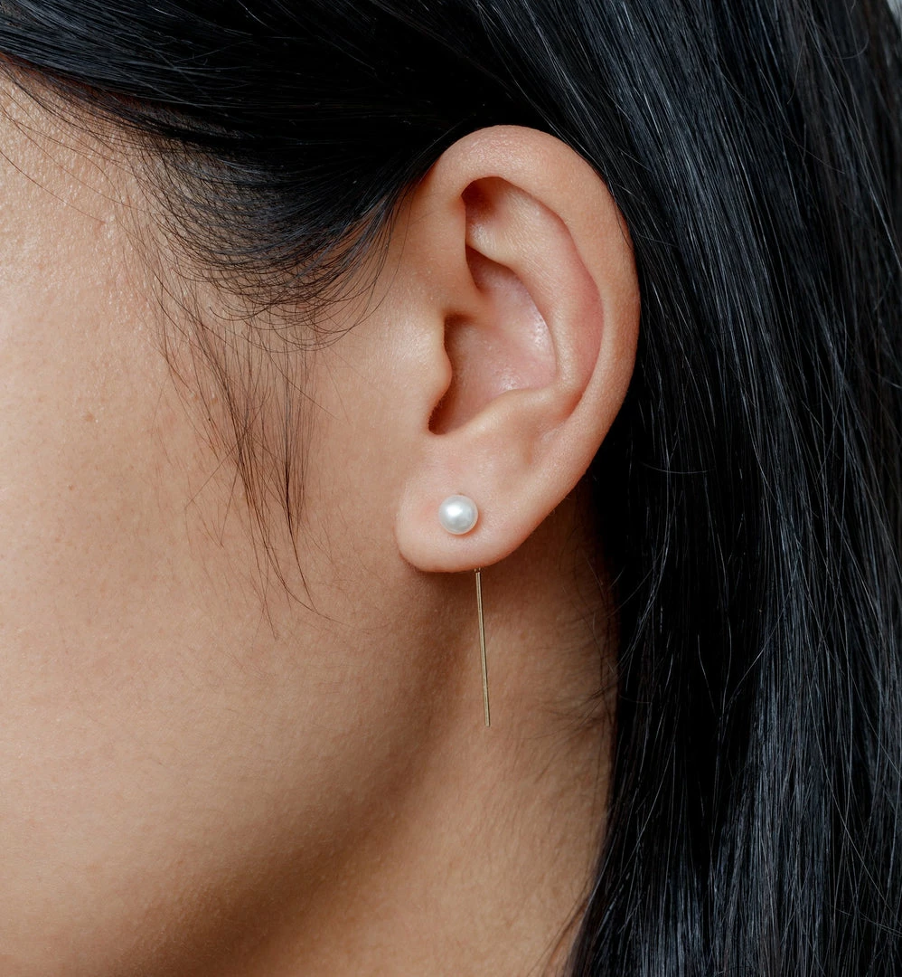 A modern twist on pearl studs, pull through threader design, 14kt solid yellow gold, fresh water cultured pearls 5.5-6mm, 1 1/2″ long.