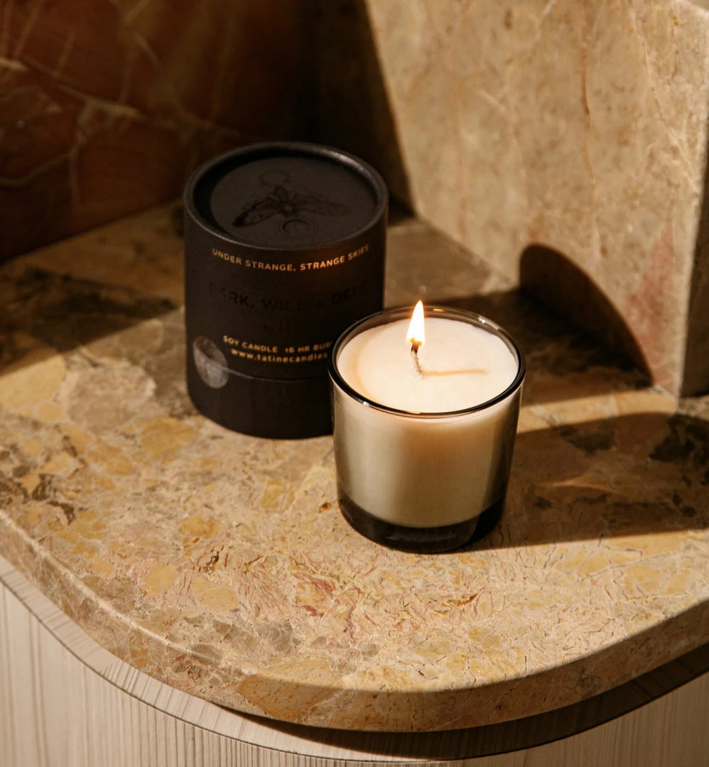 Soy wax votive candle in smoke grey glass. A potion of grapefruit flower and powdery musk, with deep notes of sandalwood, black patchouli and mysterious, bewitching golden moon oil.Â