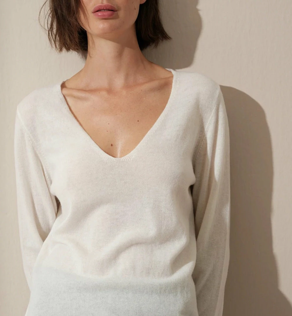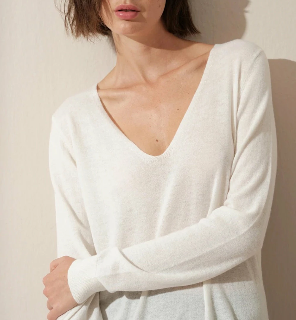 Lightweight V-neck, semi-fitted, 70% Italian superfine merino wool, 30% Italian cashmere sweater.