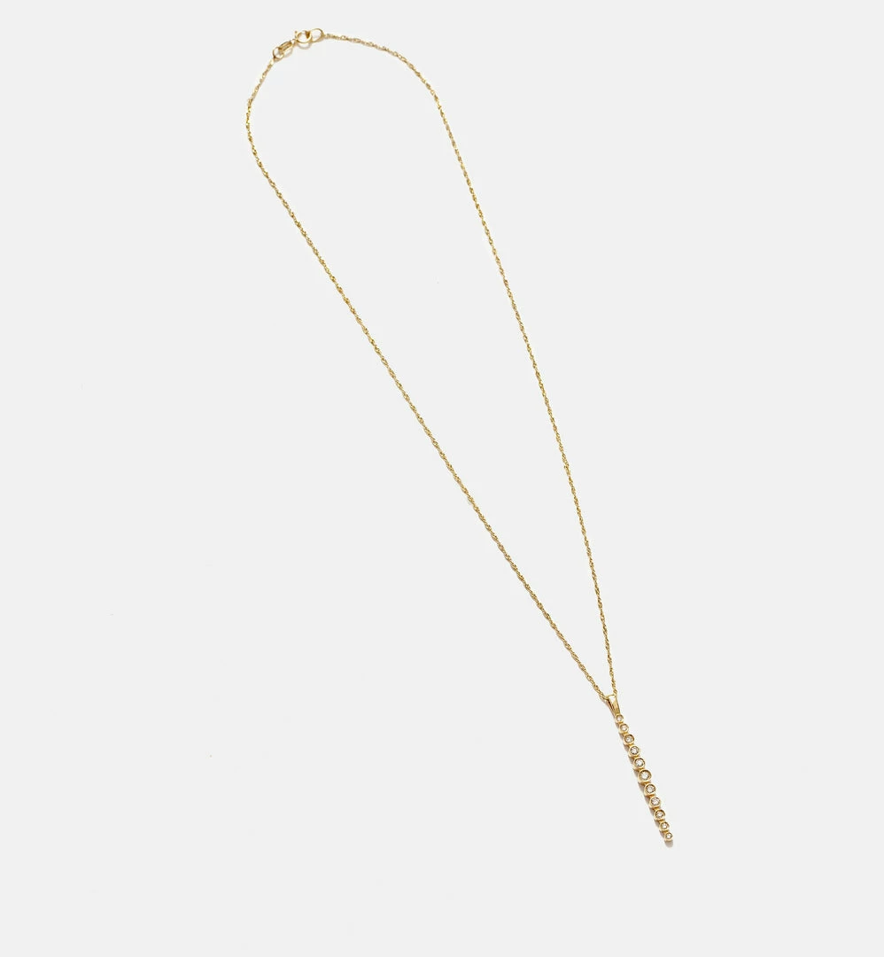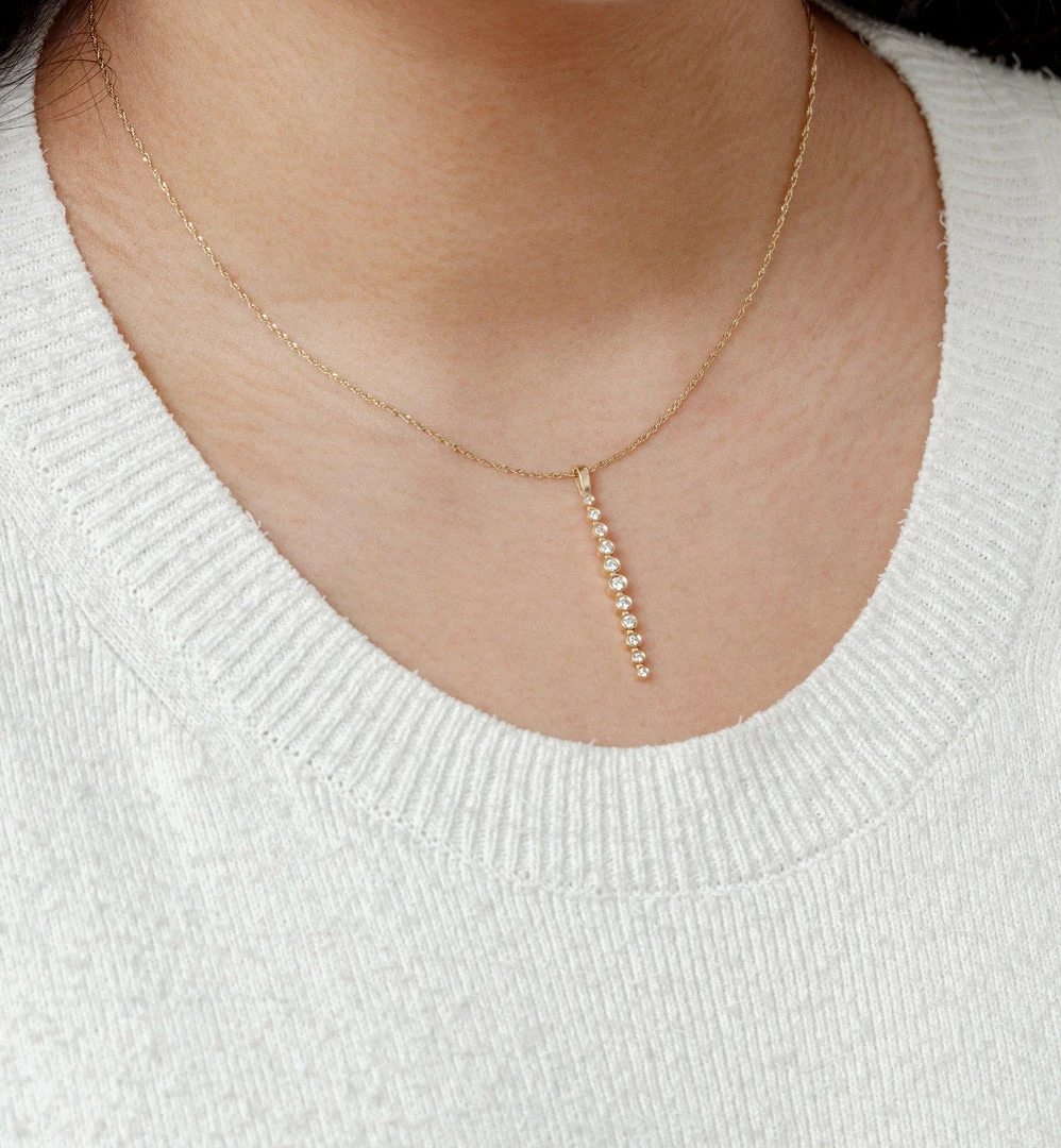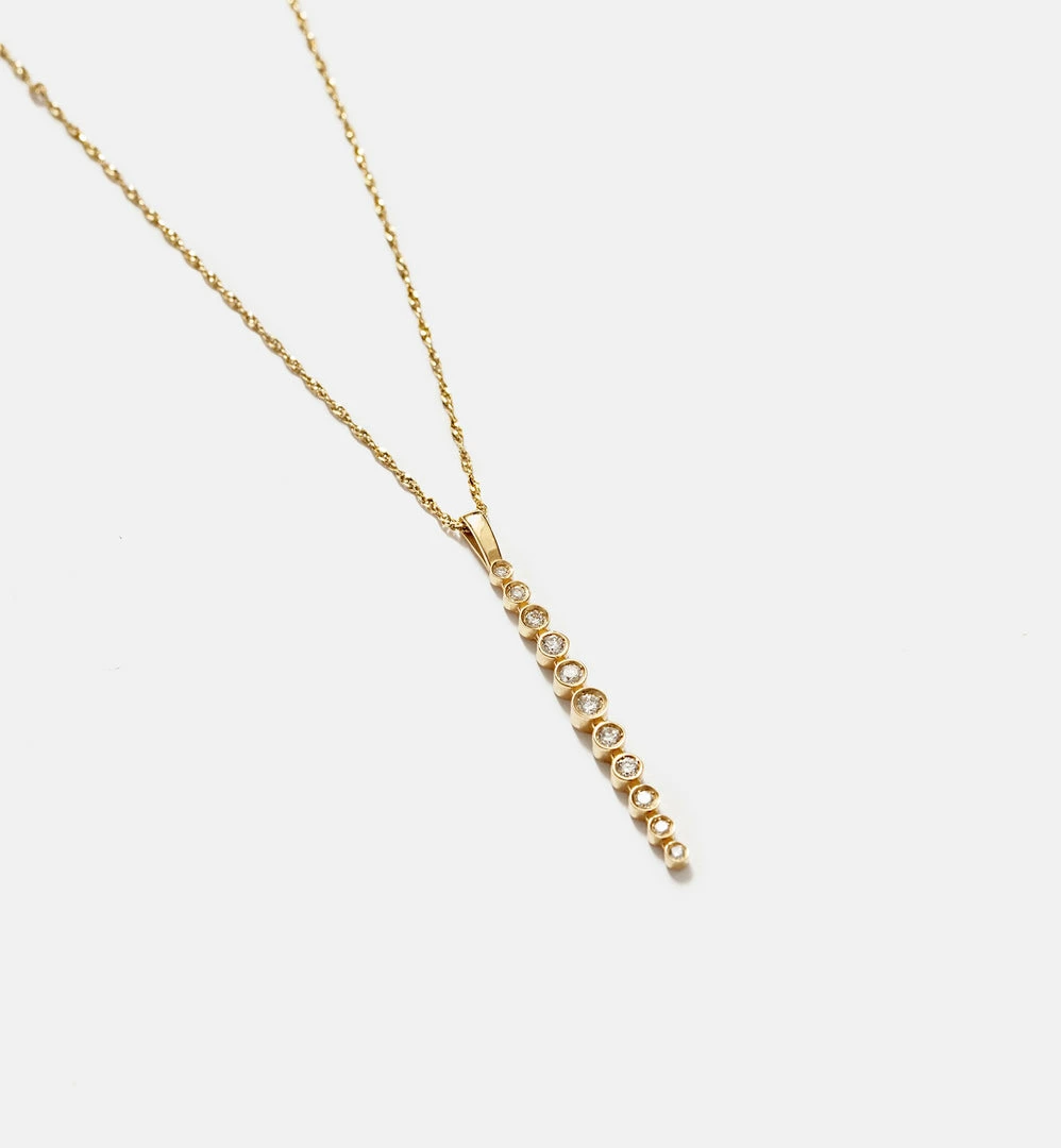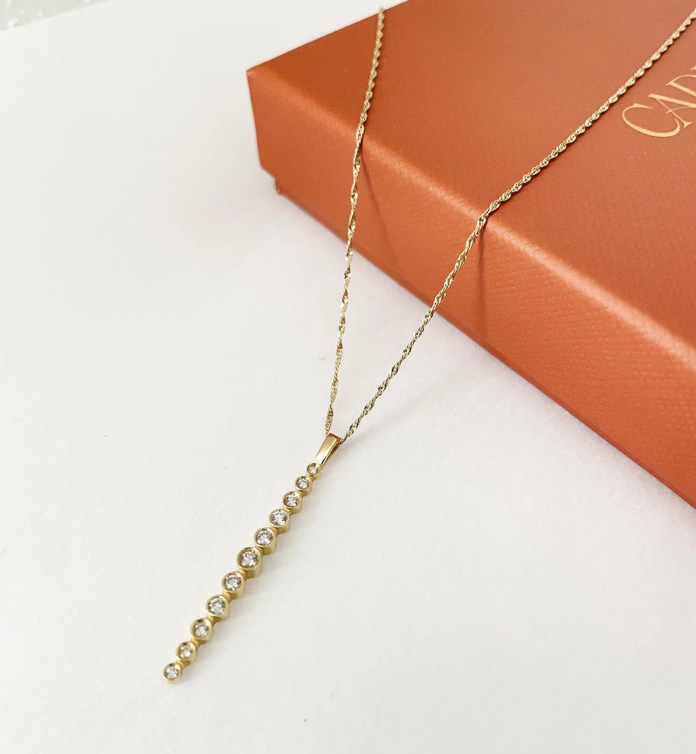 1.5″ linear pendant with 11 sparkling diamonds on 16″ chain, 30pt SI, 14kt solid yellow gold.