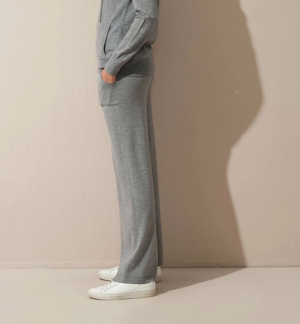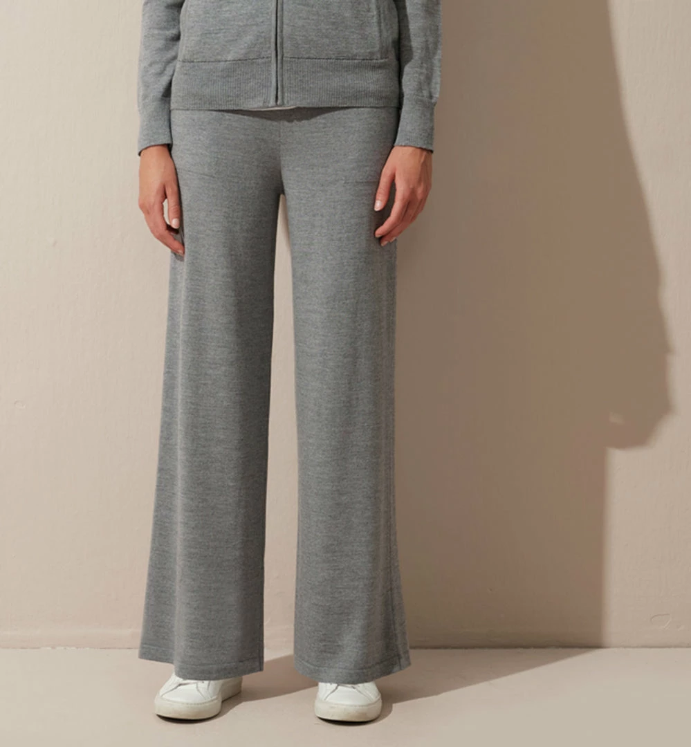Lightweight pull-on, front pockets, wide leg, 100% Italian superfine merino knit pants.