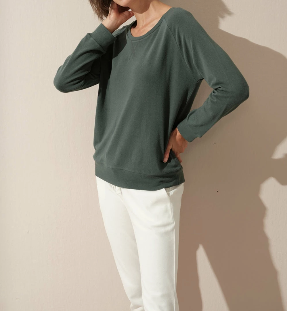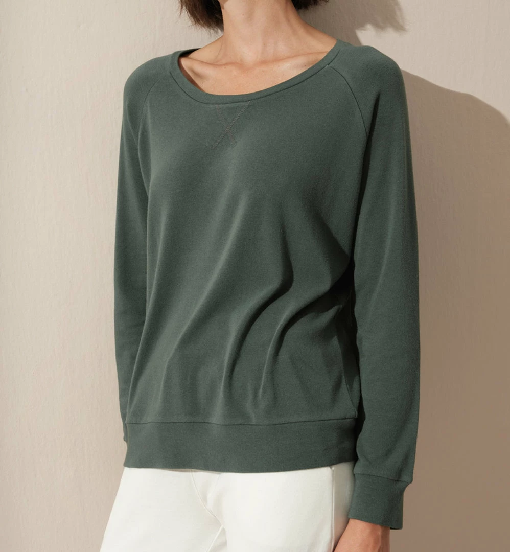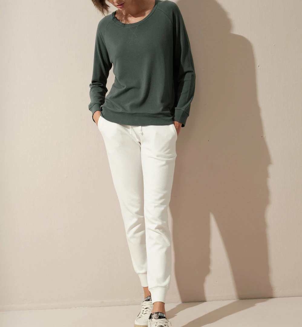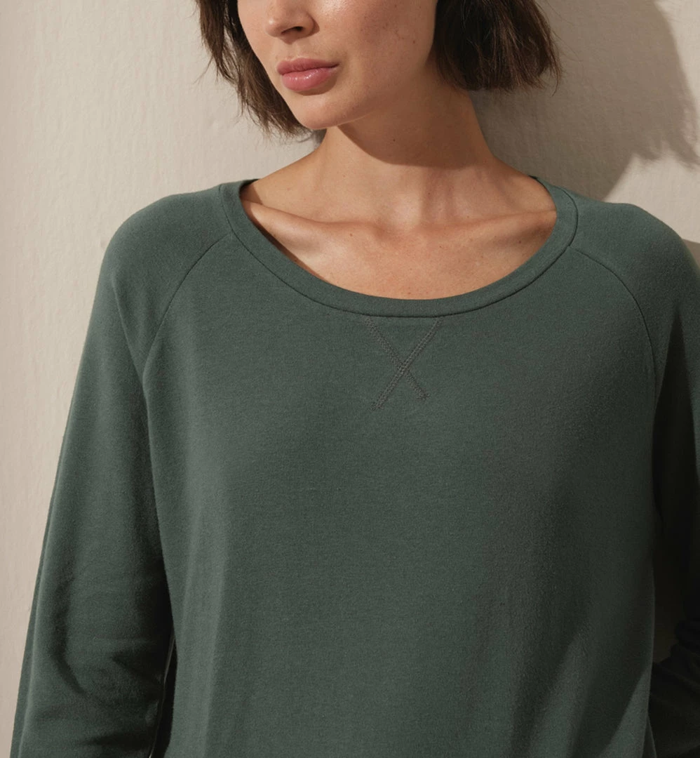 Lightweight raglan sweatshirt, easy fit, 47% cotton, 47% viscose, 6% spandex. Seen here paired with our Pedestal Joggers.