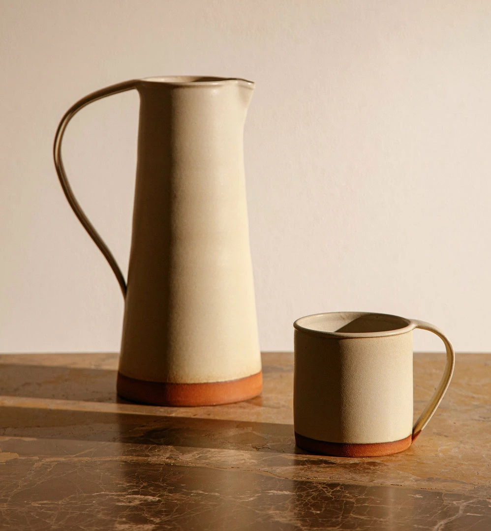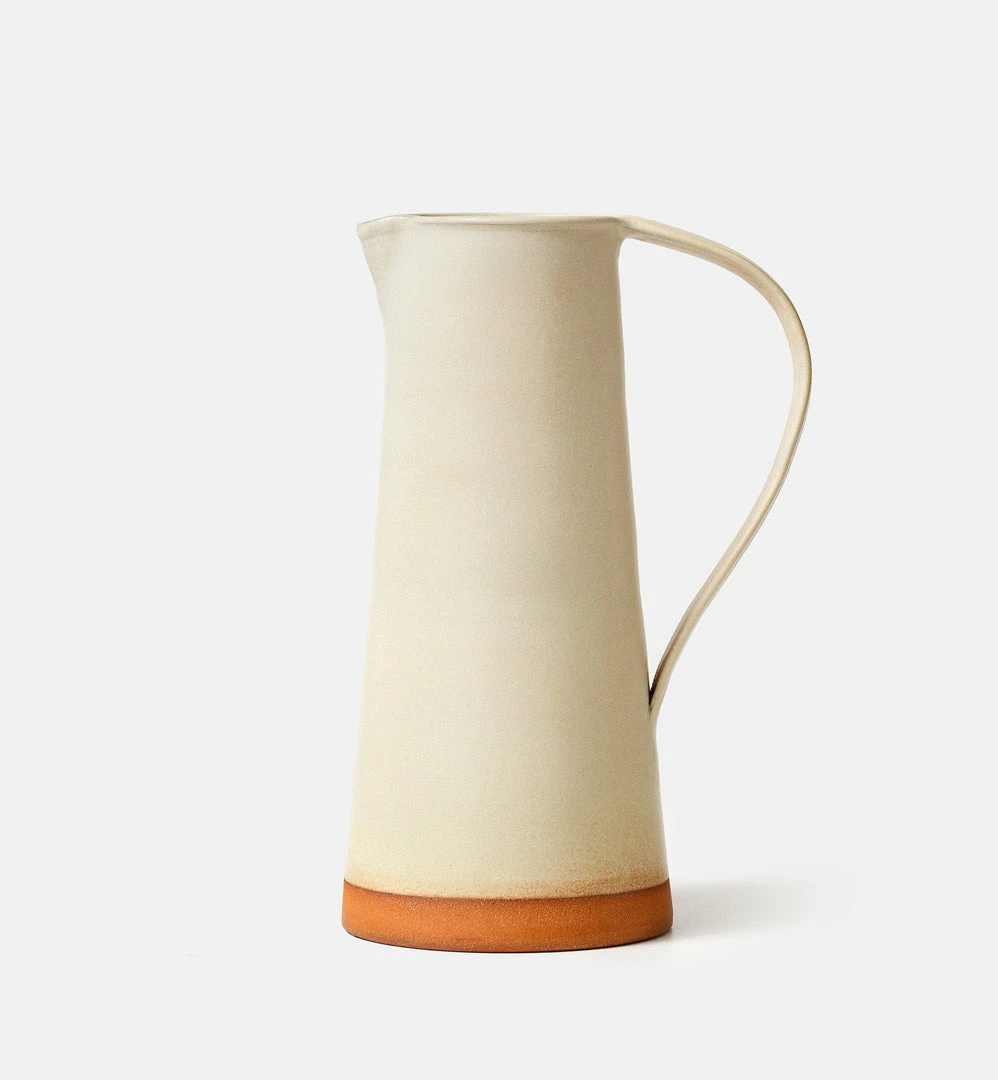 An urban interpretation of a traditional English jug. Surprisingly romantic and charming addition to the table or tray. We love serving drinks in a hand thrown pitcher and it is a perfect size for an impromptu purchase from the florist. 11” x 4”.