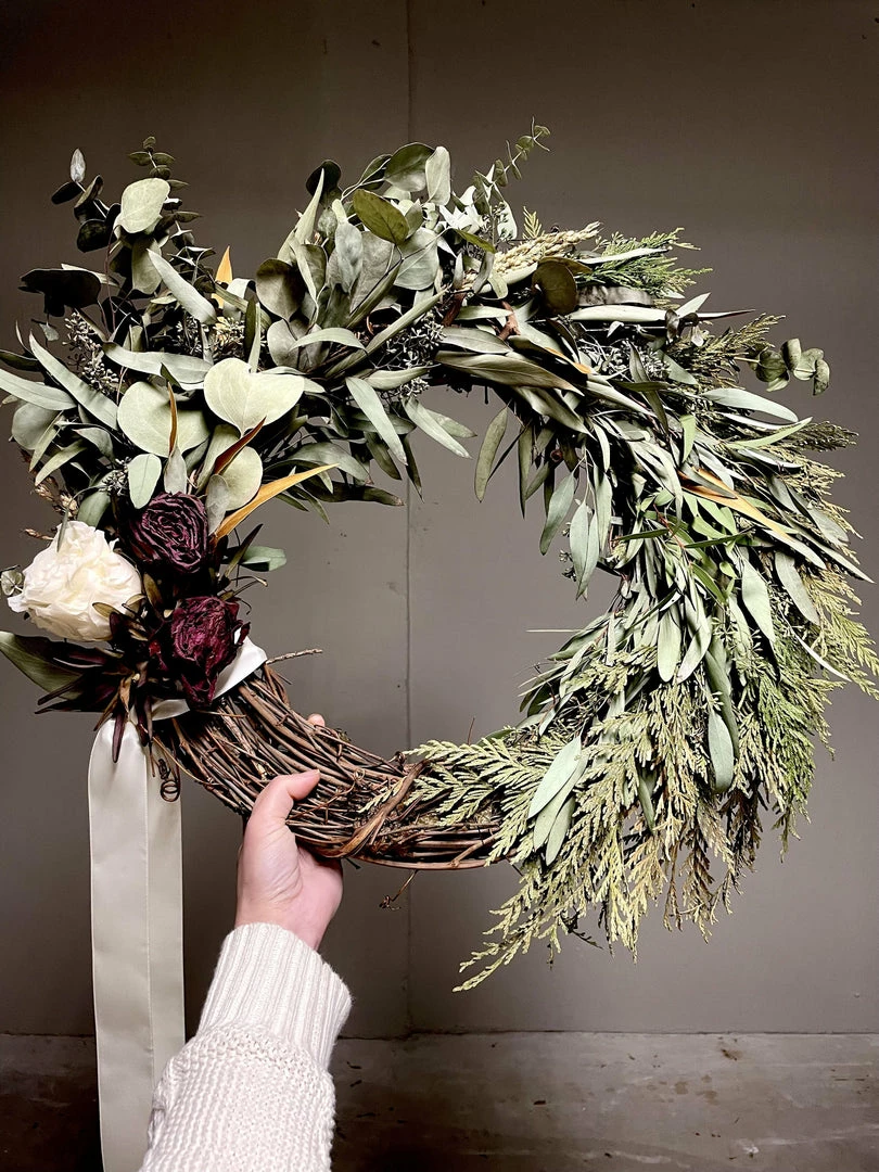 Although not identical, every wreath is created keeping with the Cadine aesthetic and quality pictured. Wreaths can be displayed indoors or in a covered area outdoors