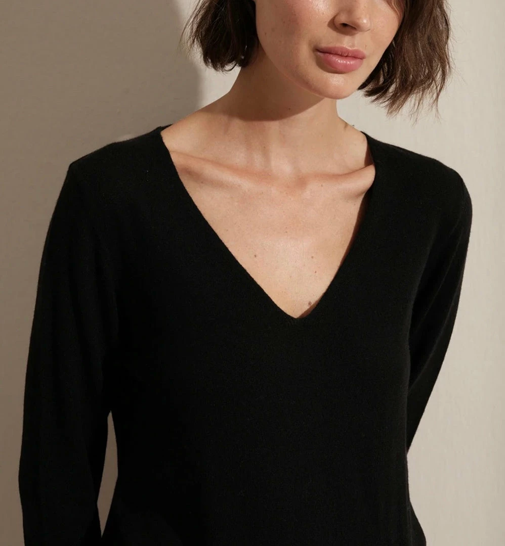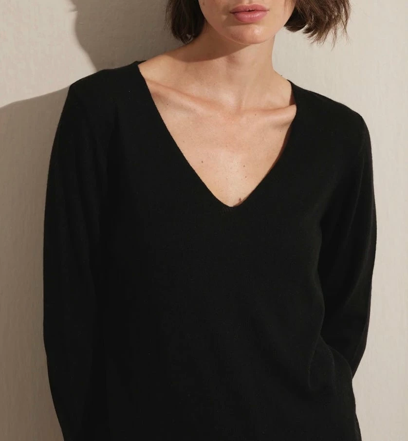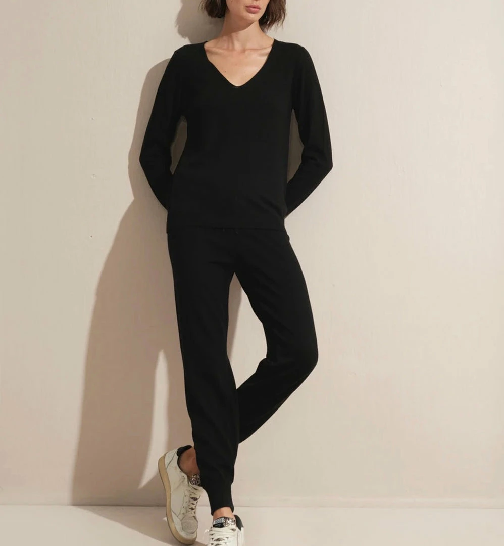 Rolled v-neck lightweight sweater, semi-fitted, 70% cotton, 30% linen. Modeled here with our Pedestal Joggers.