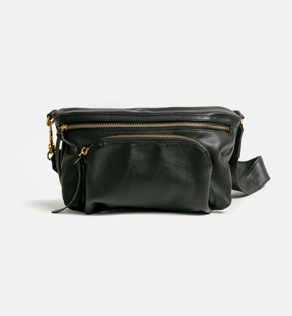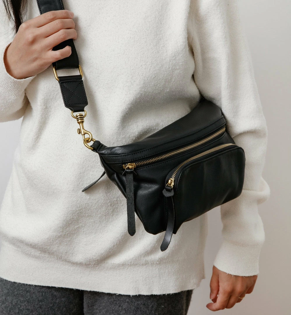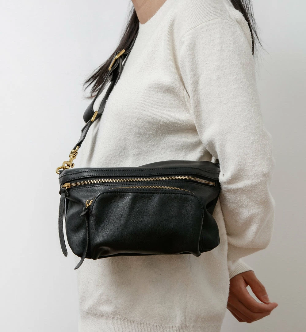 100% genuine leather bag, adjustable strap and clip allows easy transformation from hip to chest to crossbody bag, exterior zippered compartment, leather zipper pulls, matte gold hardware, lined, 10.6″ x 4″ x 6.3″ (27cm x 10cm x 16cm).