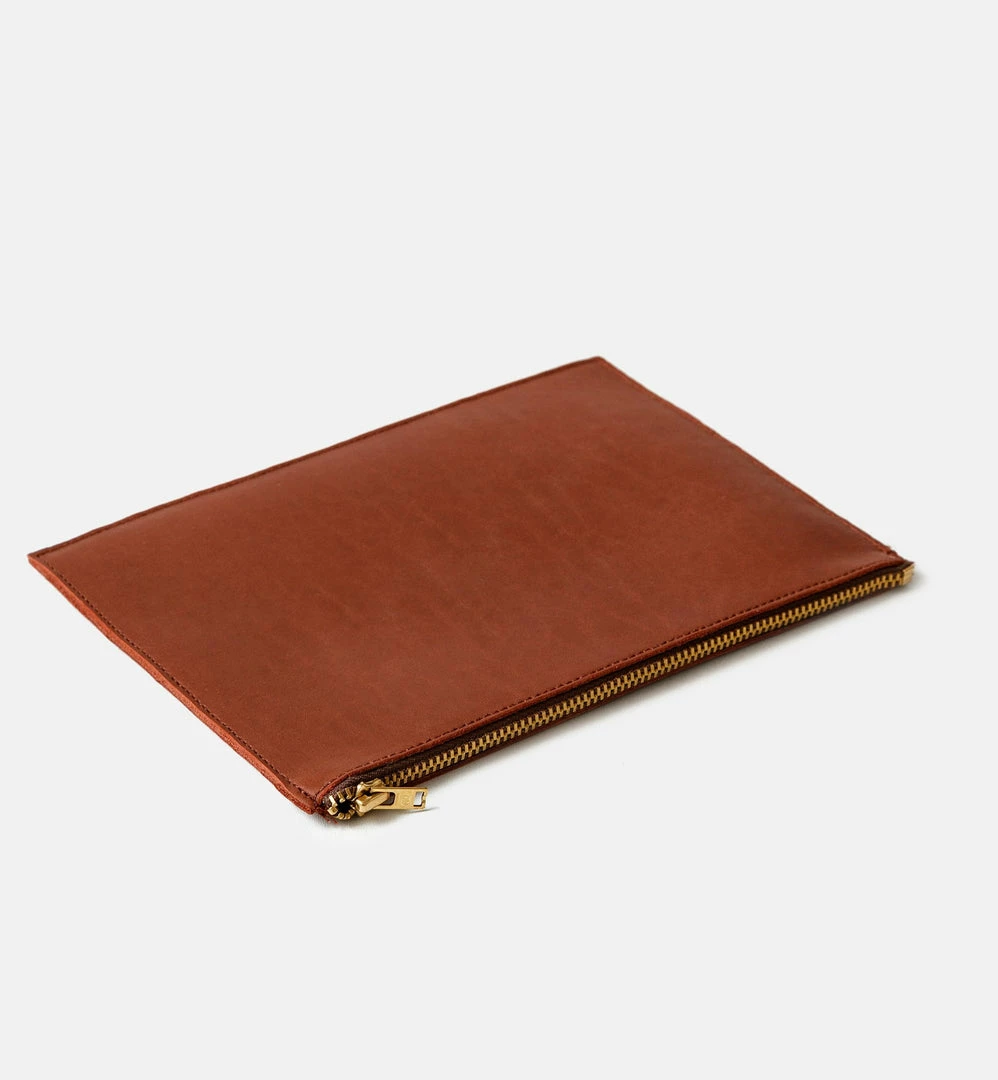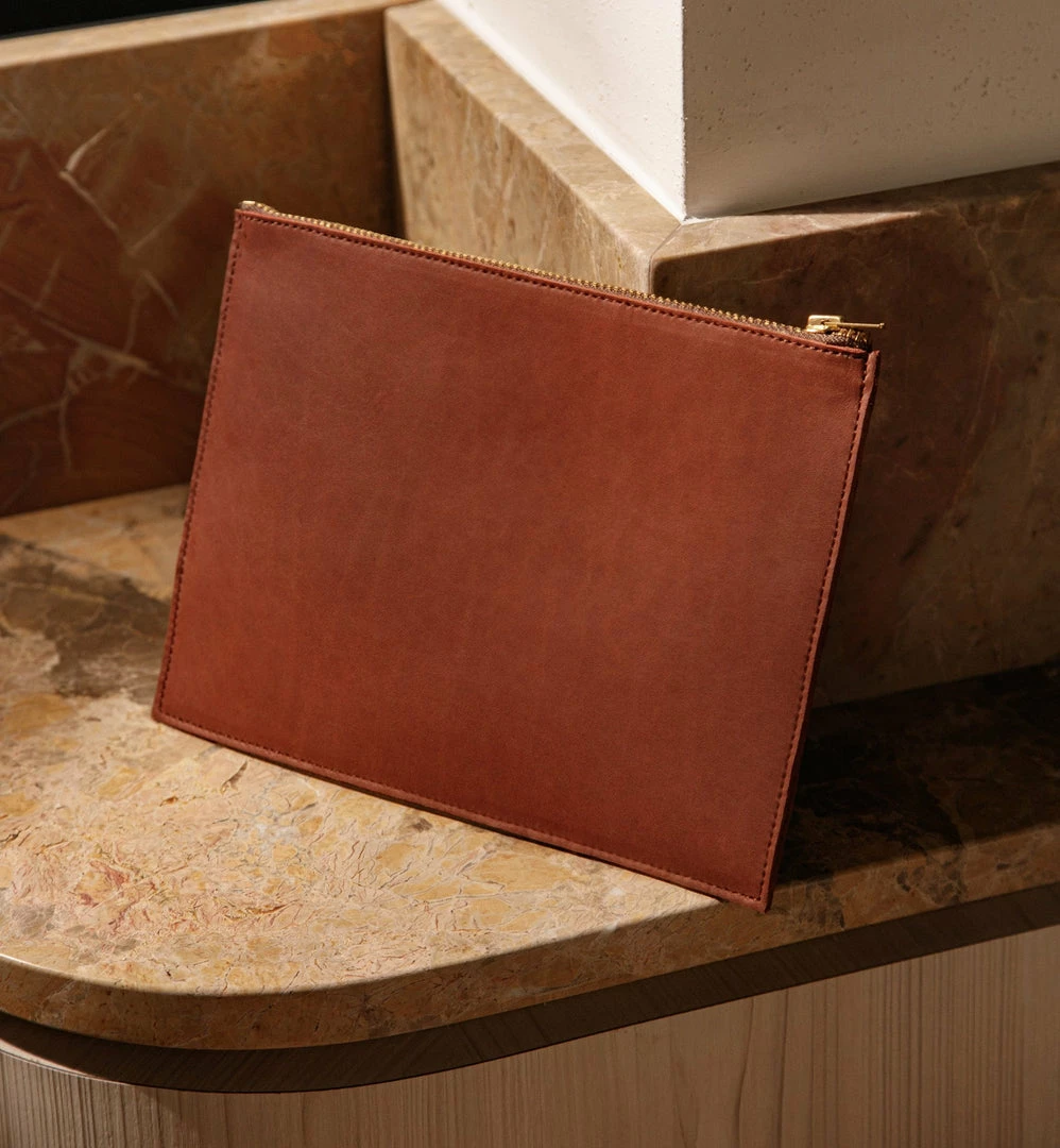 8″ x 6″ zippered pouch, genuine Italian leather, external pocket, gold zipper.