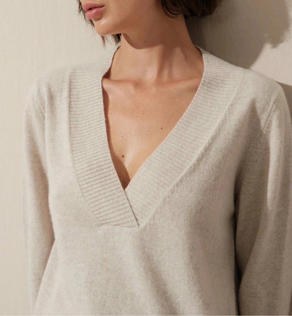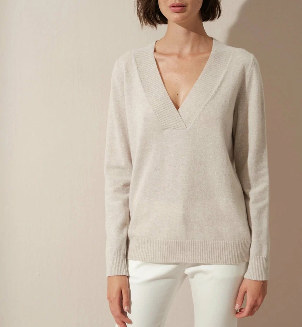 Deep v-neck, straight fit, ecologically sustainable, grade A, 70% Italian superfine merino wool, 30% Italian cashmere sweater.