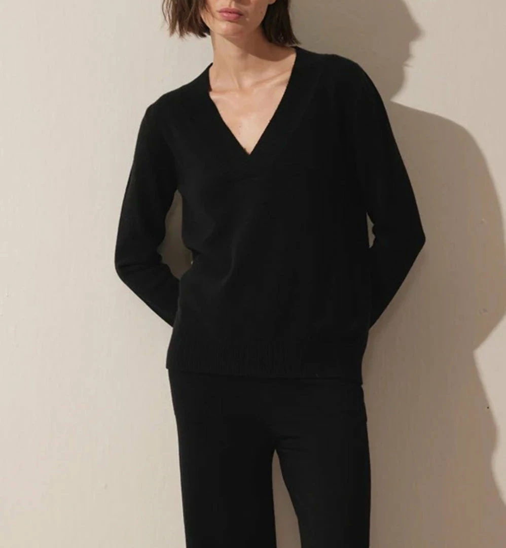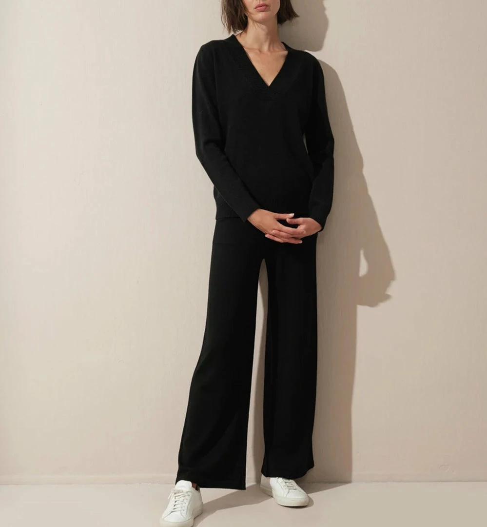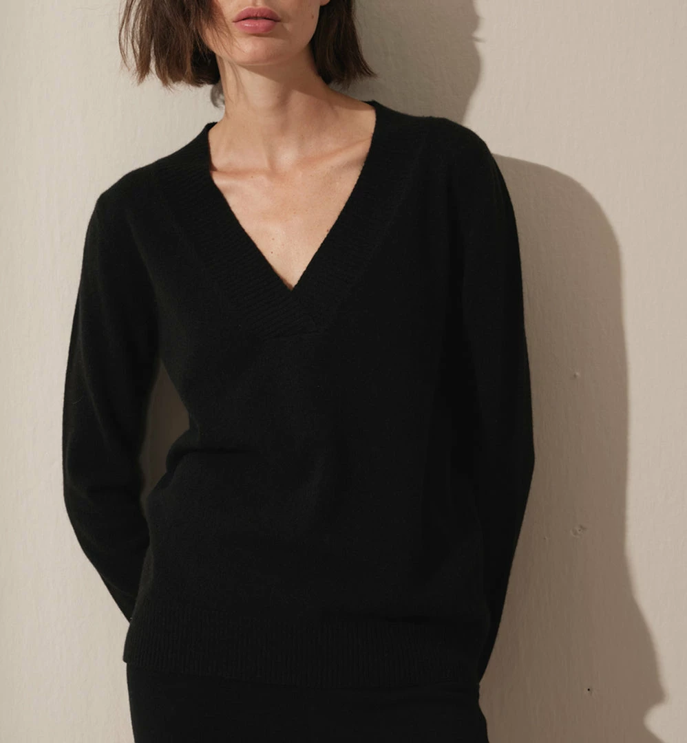 Deep v-neck, straight fit, ecologically sustainable, grade A, 70% Italian superfine merino wool, 30% Italian cashmere sweater. Seen here paired with our Pillar Knit Pant.