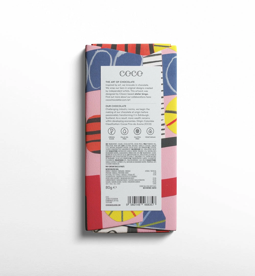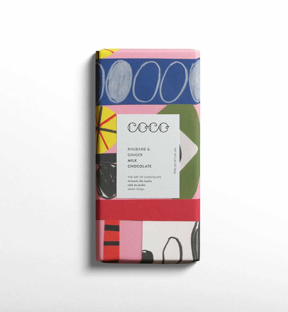 From Edinburgh, Scotland, Coco Chocolatier meticulously crafts their portfolio of contemporary chocolate with the world’s finest Colombian cocoa, before enveloping them in original designs by independent artists. The packaging is designed by Atelier Bingo led by Maxime Prou and Adèle Favreau, two illustrator, surface pattern & graphic designer from France. They love experimenting with screen printing and other graphic techniques to create colorful and abstract works.