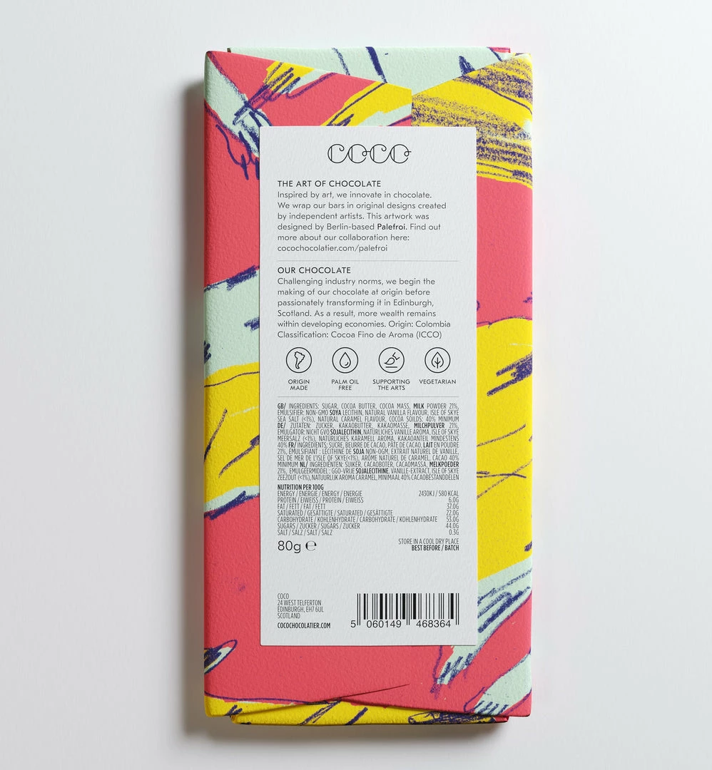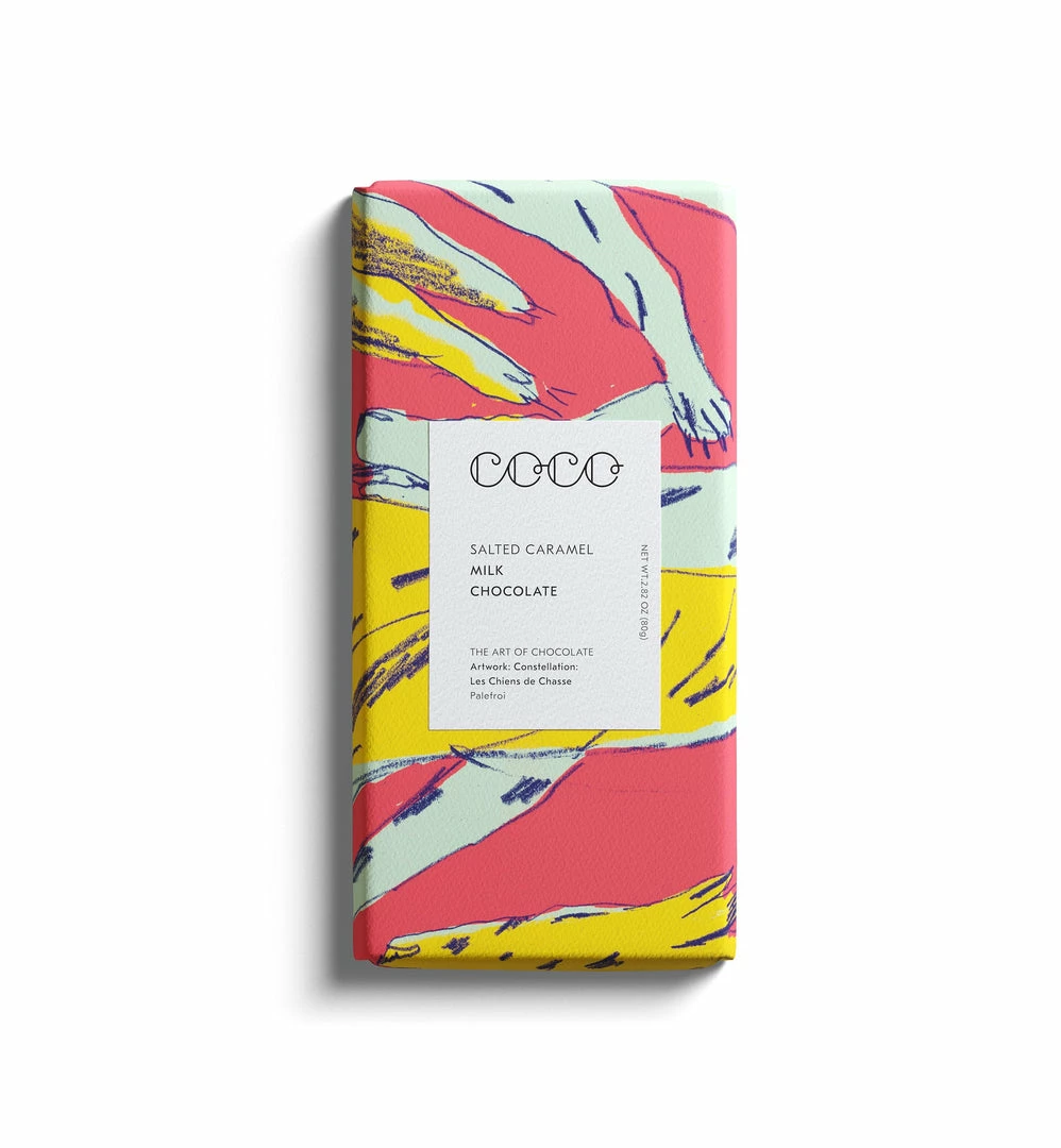From Edinburgh, Scotland, Coco Chocolatier meticulously crafts their portfolio of contemporary chocolate with the world’s finest Colombian cocoa, before enveloping them in original designs by independent artists. The packaging is designed by French artists Damien Tran and Marion Jdnaoff of Palefroi. Currently based in Berlin, the duo work at the crossroads of printmaking, illustration, publishing and applied arts.Â