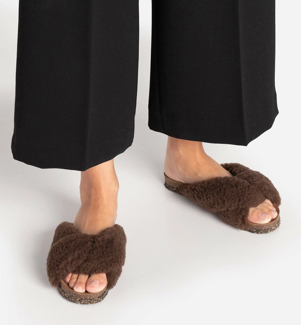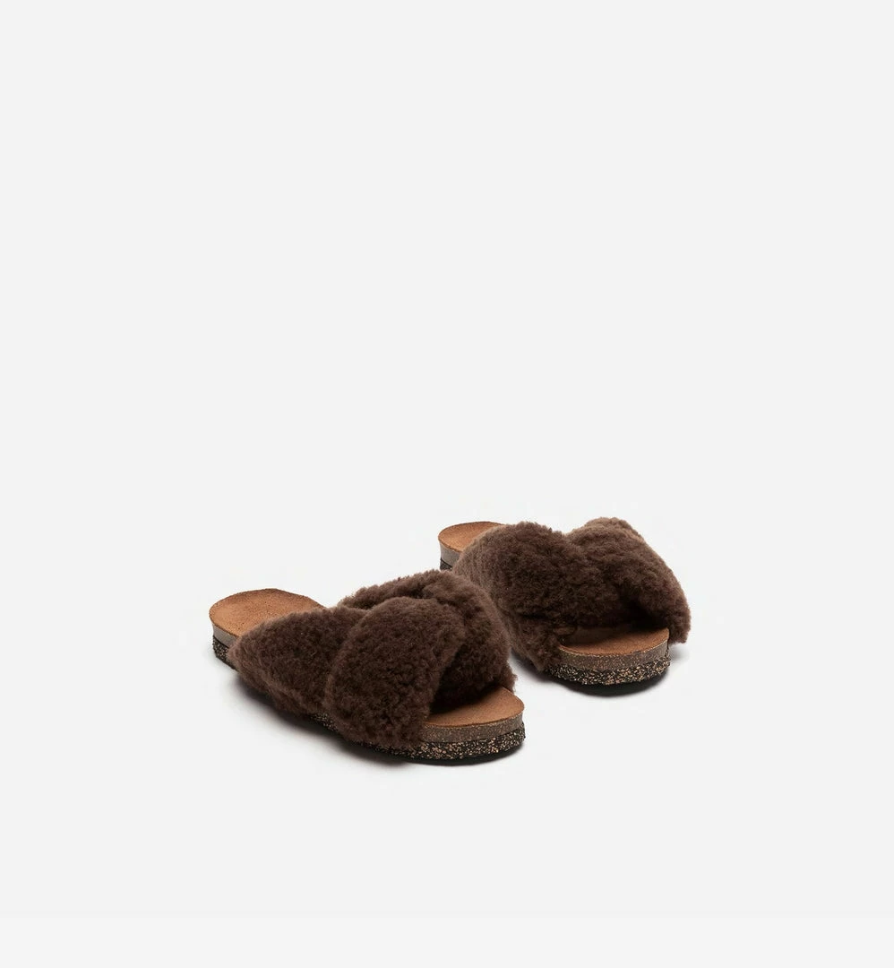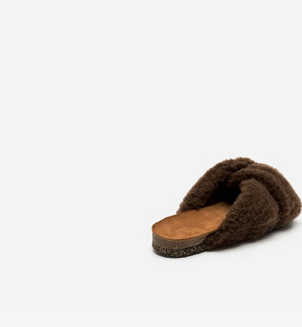 A whimsical slip-on sandal made for both indoor and outdoor wear. Featuring a crossover strap wrapped in faux fur and an outsole made out of recycled cork and rubber. Sculpted footbed for luxurious comfort and support. Fits true to size.Â