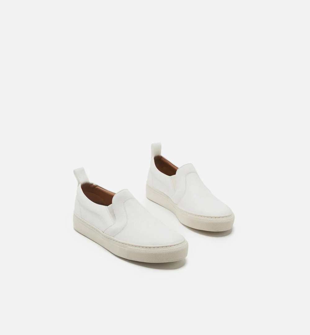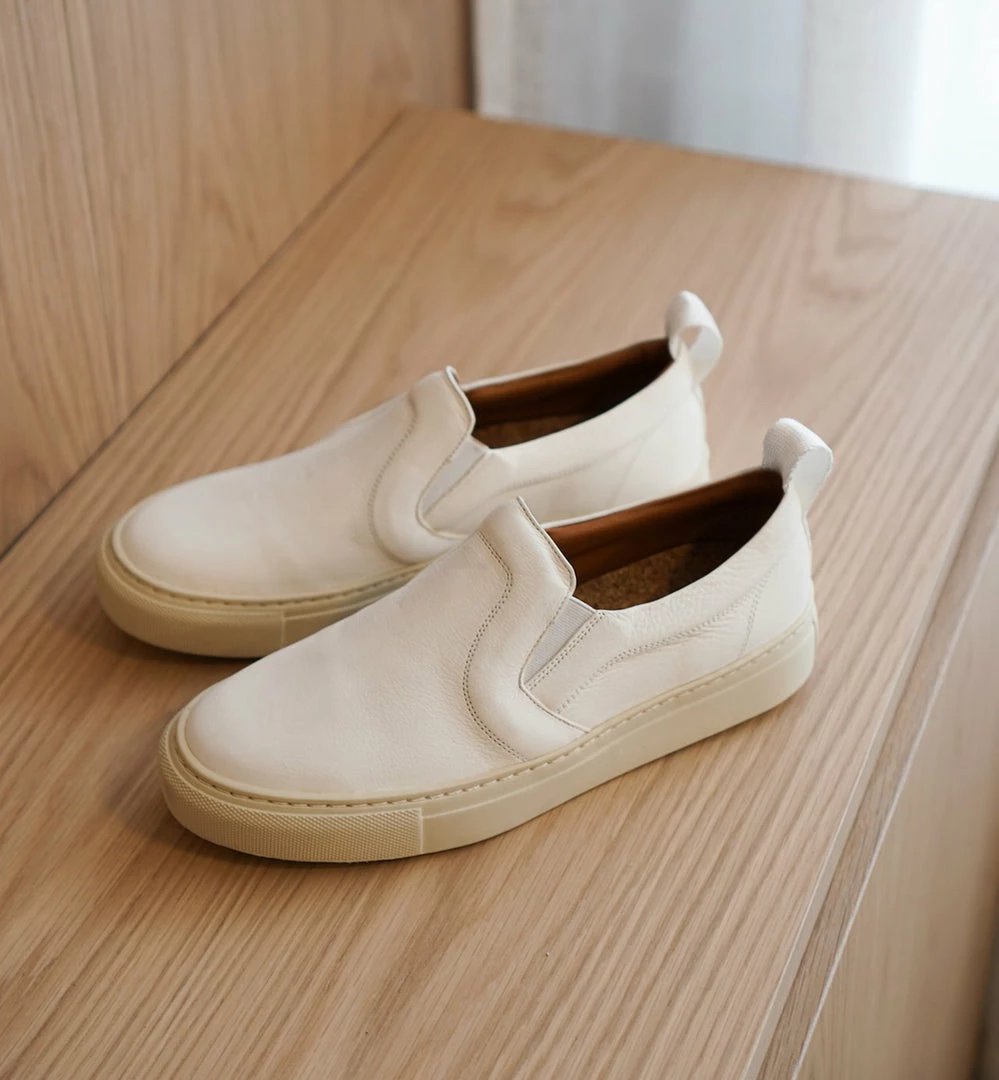 A classic laceless slip-on shoe made out of fine leather, beige distressed look rubber outsole, 25mm sole, size down if you are in between sizes.