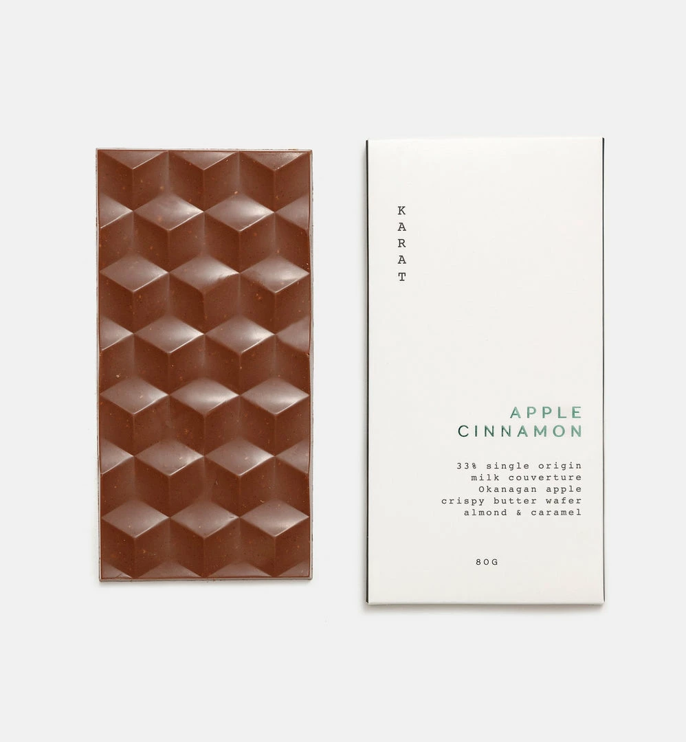 33% premium couverture milk chocolate, organic Okanagan sour green apple, toasted almond, salted caramel, cinnamon, crispy crepe; sweet, salty, sour, and bitter – this bar has it all, gluten free.