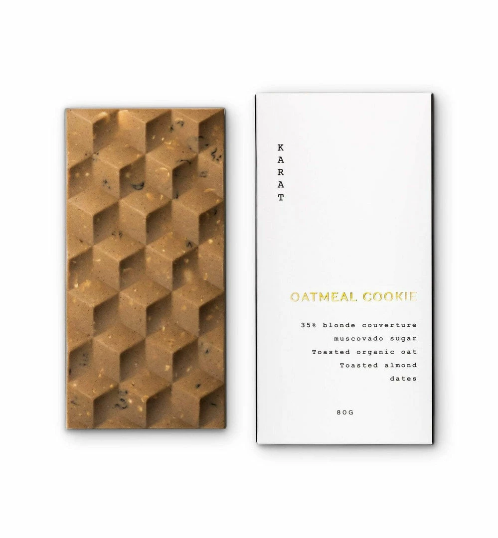 36% white couverture chocolate, muscovado sugar, toasted gluten free organic oats, toasted almonds, cinnamon, raisins and medjool dates, sea salt, gluten free.