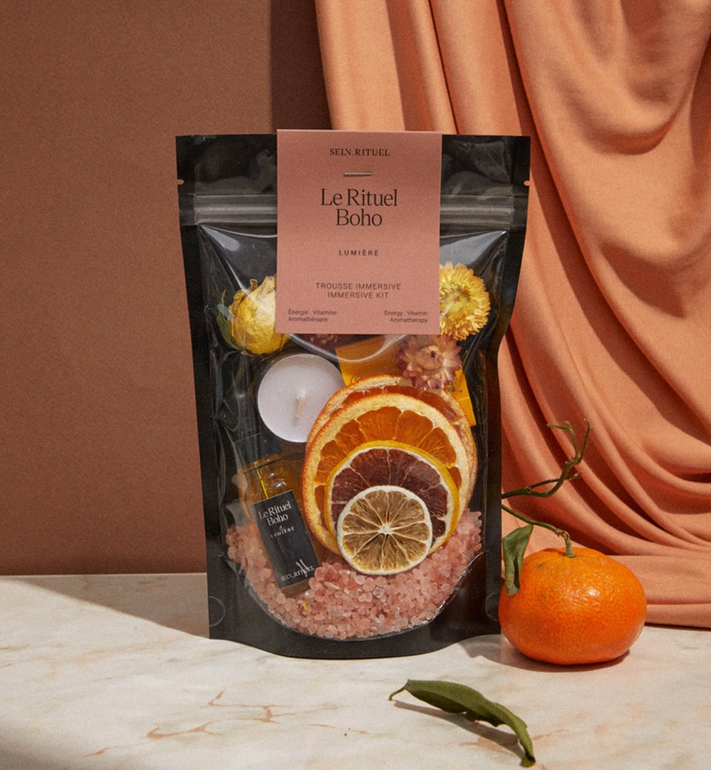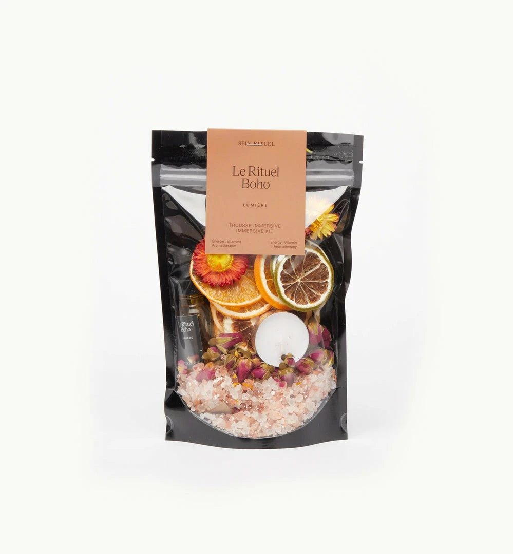 Contains: Himalayan pink salt, straw flowers, jasmine flowers, paper lantern, pack of 36 incense matches, botanical oil Rituel Boho (clementine essential oil, lemon essential oil, lime essential oil, grapefruit essential oil, sweet almond oil, argan oil, avocado oil, apricot oil, natural fragrance, orange peel and vitamin E).
