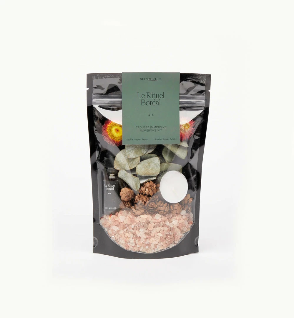 Contains: Himalayan pink salt, straw flowers, eucalyptus, pine cone, paper lantern, pack of 36 matches, incense, Rituel Boréal botanical oil (balsam fir essential oil, sweet almond oil, argan oil, avocado oil, apricot oil, natural fragrance and vitamins).